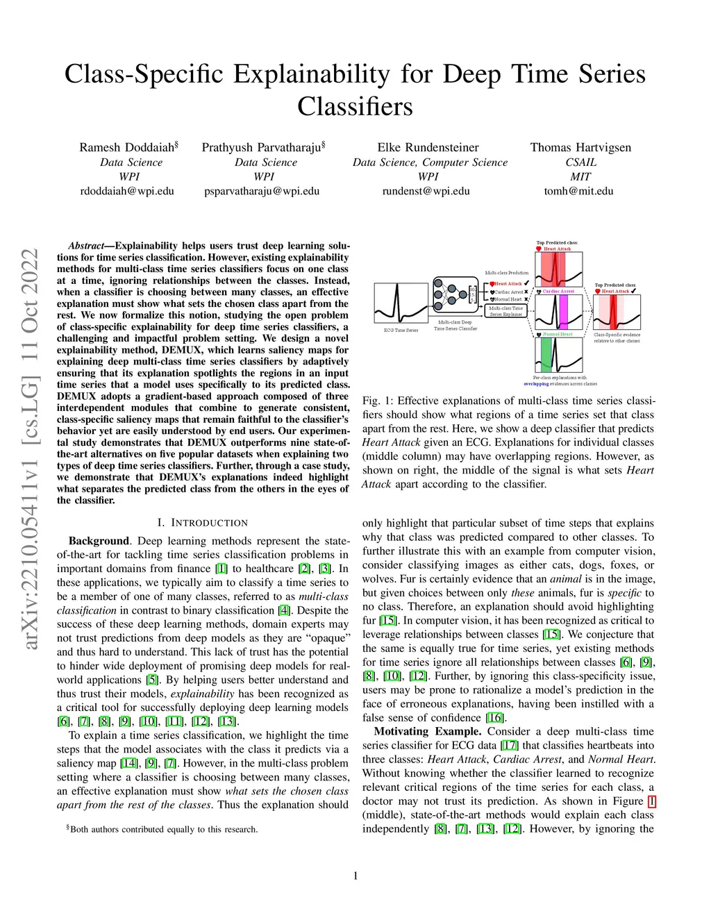 Explainability helps users trust deep learning solutions for time series classification. However, existing explainability methods for multi-class time series classifiers focus on one class at a time, ignoring relationships between the classes. Instead, when a classifier is choosing between many classes, an effective explanation must show what sets the chosen class apart from the rest. We now formalize this notion, studying the open problem of class-specific explainability for deep time series classifiers, a challenging and impactful problem setting. We design a novel explainability method, DEMUX, which learns saliency maps for explaining deep multi-class time series classifiers by adaptively ensuring that its explanation spotlights the regions in an input time series that a model uses specifically to its predicted class. DEMUX adopts a gradient-based approach composed of three interdependent modules that combine to generate consistent, class-specific saliency maps that remain faithful to the classifier's behavior yet are easily understood by end users. Our experimental study demonstrates that DEMUX outperforms nine state-of-the-art alternatives on five popular datasets when explaining two types of deep time series classifiers. Further, through a case study, we demonstrate that DEMUX's explanations indeed highlight what separates the predicted class from the others in the eyes of the classifier. Our code is publicly available at https://github.com/rameshdoddaiah/DEMUX.