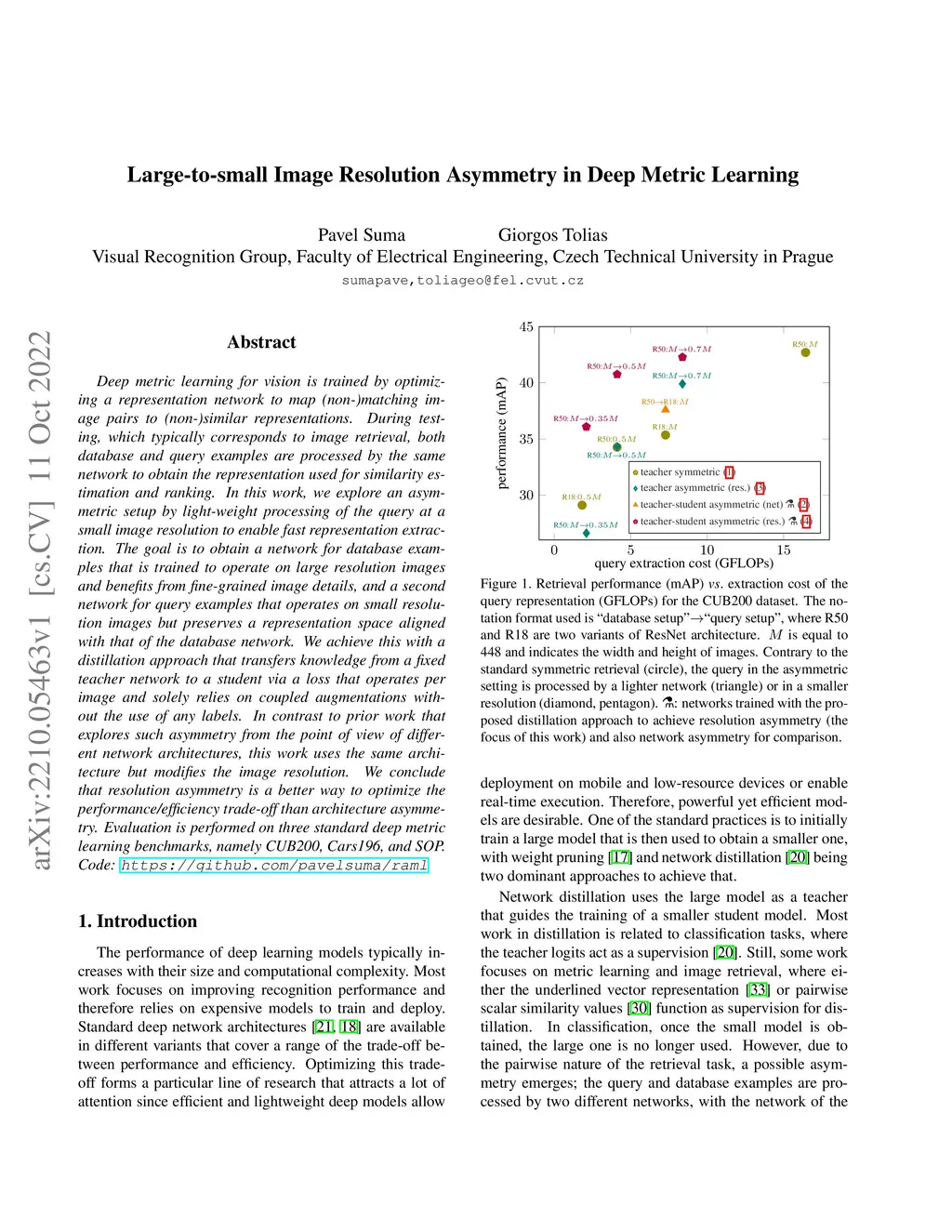 Deep metric learning for vision is trained by optimizing a representation network to map (non-)matching image pairs to (non-)similar representations. During testing, which typically corresponds to image retrieval, both database and query examples are processed by the same network to obtain the representation used for similarity estimation and ranking. In this work, we explore an asymmetric setup by light-weight processing of the query at a small image resolution to enable fast representation extraction. The goal is to obtain a network for database examples that is trained to operate on large resolution images and benefits from fine-grained image details, and a second network for query examples that operates on small resolution images but preserves a representation space aligned with that of the database network. We achieve this with a distillation approach that transfers knowledge from a fixed teacher network to a student via a loss that operates per image and solely relies on coupled augmentations without the use of any labels. In contrast to prior work that explores such asymmetry from the point of view of different network architectures, this work uses the same architecture but modifies the image resolution. We conclude that resolution asymmetry is a better way to optimize the performance/efficiency trade-off than architecture asymmetry. Evaluation is performed on three standard deep metric learning benchmarks, namely CUB200, Cars196, and SOP. Code: https://github.com/pavelsuma/raml