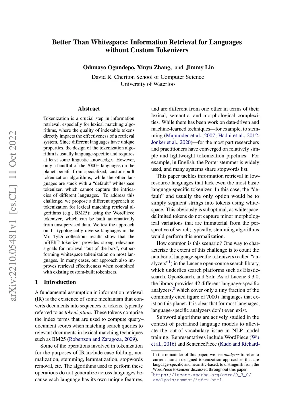 Tokenization is a crucial step in information retrieval, especially for lexical matching algorithms, where the quality of indexable tokens directly impacts the effectiveness of a retrieval system. Since different languages have unique properties, the design of the tokenization algorithm is usually language-specific and requires at least some lingustic knowledge. However, only a handful of the 7000+ languages on the planet benefit from specialized, custom-built tokenization algorithms, while the other languages are stuck with a "default" whitespace tokenizer, which cannot capture the intricacies of different languages. To address this challenge, we propose a different approach to tokenization for lexical matching retrieval algorithms (e.g., BM25): using the WordPiece tokenizer, which can be built automatically from unsupervised data. We test the approach on 11 typologically diverse languages in the MrTyDi collection: results show that the mBERT tokenizer provides strong relevance signals for retrieval "out of the box", outperforming whitespace tokenization on most languages. In many cases, our approach also improves retrieval effectiveness when combined with existing custom-built tokenizers.