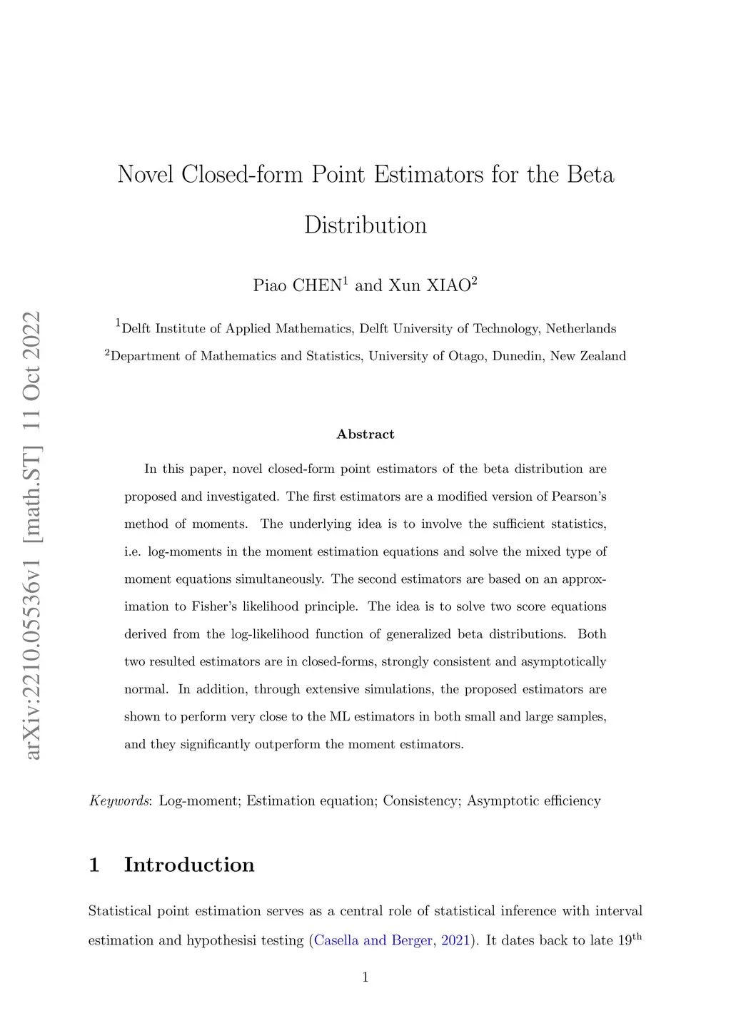 In this paper, novel closed-form point estimators of the beta distribution are proposed and investigated. The first estimators are a modified version of Pearson's method of moments. The underlying idea is to involve the sufficient statistics, i.e., log-moments in the moment estimation equations and solve the mixed type of moment equations simultaneously. The second estimators are based on an approximation to Fisher's likelihood principle. The idea is to solve two score equations derived from the log-likelihood function of generalized beta distributions. Both two resulted estimators are in closed forms, strongly consistent and asymptotically normal. In addition, through extensive simulations, the proposed estimators are shown to perform very close to the ML estimators in both small and large samples, and they significantly outperform the moment estimators.