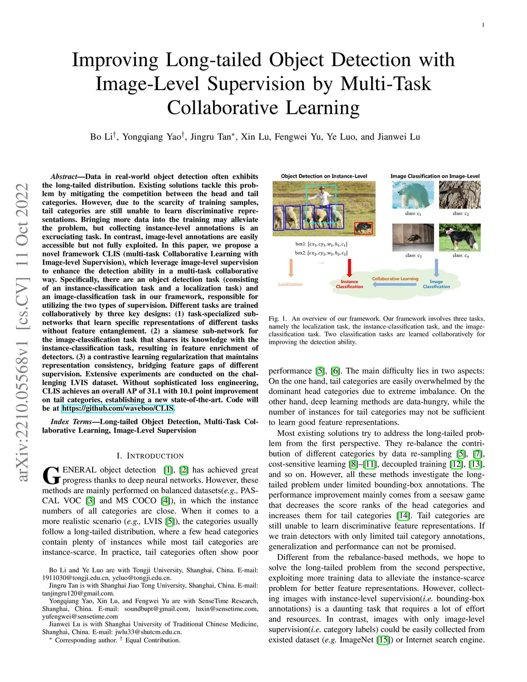 Data in real-world object detection often exhibits the long-tailed distribution. Existing solutions tackle this problem by mitigating the competition between the head and tail categories. However, due to the scarcity of training samples, tail categories are still unable to learn discriminative representations. Bringing more data into the training may alleviate the problem, but collecting instance-level annotations is an excruciating task. In contrast, image-level annotations are easily accessible but not fully exploited. In this paper, we propose a novel framework CLIS (multi-task Collaborative Learning with Image-level Supervision), which leverage image-level supervision to enhance the detection ability in a multi-task collaborative way. Specifically, there are an object detection task (consisting of an instance-classification task and a localization task) and an image-classification task in our framework, responsible for utilizing the two types of supervision. Different tasks are trained collaboratively by three key designs: (1) task-specialized sub-networks that learn specific representations of different tasks without feature entanglement. (2) a siamese sub-network for the image-classification task that shares its knowledge with the instance-classification task, resulting in feature enrichment of detectors. (3) a contrastive learning regularization that maintains representation consistency, bridging feature gaps of different supervision. Extensive experiments are conducted on the challenging LVIS dataset. Without sophisticated loss engineering, CLIS achieves an overall AP of 31.1 with 10.1 point improvement on tail categories, establishing a new state-of-the-art. Code will be at https://github.com/waveboo/CLIS.