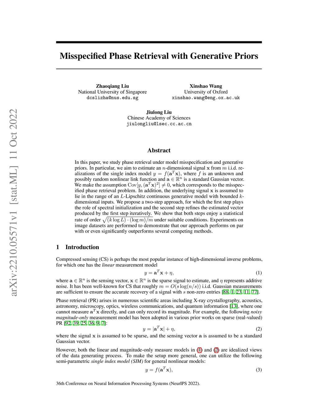 In this paper, we study phase retrieval under model misspecification and generative priors. In particular, we aim to estimate an -dimensional signal from i.i.d.~realizations of the single index model , where is an unknown and possibly random nonlinear link function and is a standard Gaussian vector. We make the assumption , which corresponds to the misspecified phase retrieval problem. In addition, the underlying signal is assumed to lie in the range of an -Lipschitz continuous generative model with bounded -dimensional inputs. We propose a two-step approach, for which the first step plays the role of spectral initialization and the second step refines the estimated vector produced by the first step iteratively. We show that both steps enjoy a statistical rate of order under suitable conditions. Experiments on image datasets are performed to demonstrate that our approach performs on par with or even significantly outperforms several competing methods.