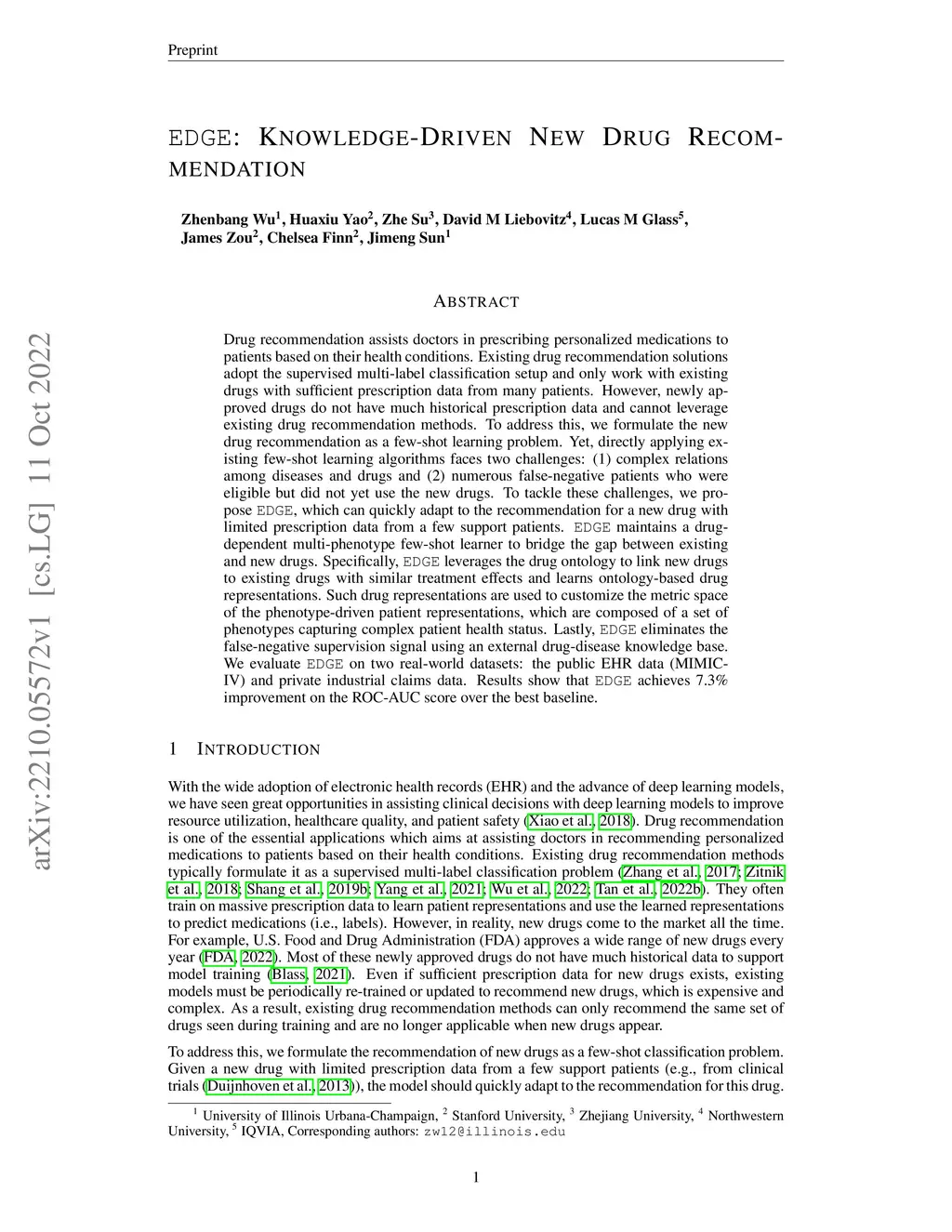 Drug recommendation assists doctors in prescribing personalized medications to patients based on their health conditions. Existing drug recommendation solutions adopt the supervised multi-label classification setup and only work with existing drugs with sufficient prescription data from many patients. However, newly approved drugs do not have much historical prescription data and cannot leverage existing drug recommendation methods. To address this, we formulate the new drug recommendation as a few-shot learning problem. Yet, directly applying existing few-shot learning algorithms faces two challenges: (1) complex relations among diseases and drugs and (2) numerous false-negative patients who were eligible but did not yet use the new drugs. To tackle these challenges, we propose EDGE, which can quickly adapt to the recommendation for a new drug with limited prescription data from a few support patients. EDGE maintains a drug-dependent multi-phenotype few-shot learner to bridge the gap between existing and new drugs. Specifically, EDGE leverages the drug ontology to link new drugs to existing drugs with similar treatment effects and learns ontology-based drug representations. Such drug representations are used to customize the metric space of the phenotype-driven patient representations, which are composed of a set of phenotypes capturing complex patient health status. Lastly, EDGE eliminates the false-negative supervision signal using an external drug-disease knowledge base. We evaluate EDGE on two real-world datasets: the public EHR data (MIMIC-IV) and private industrial claims data. Results show that EDGE achieves 7.3% improvement on the ROC-AUC score over the best baseline.