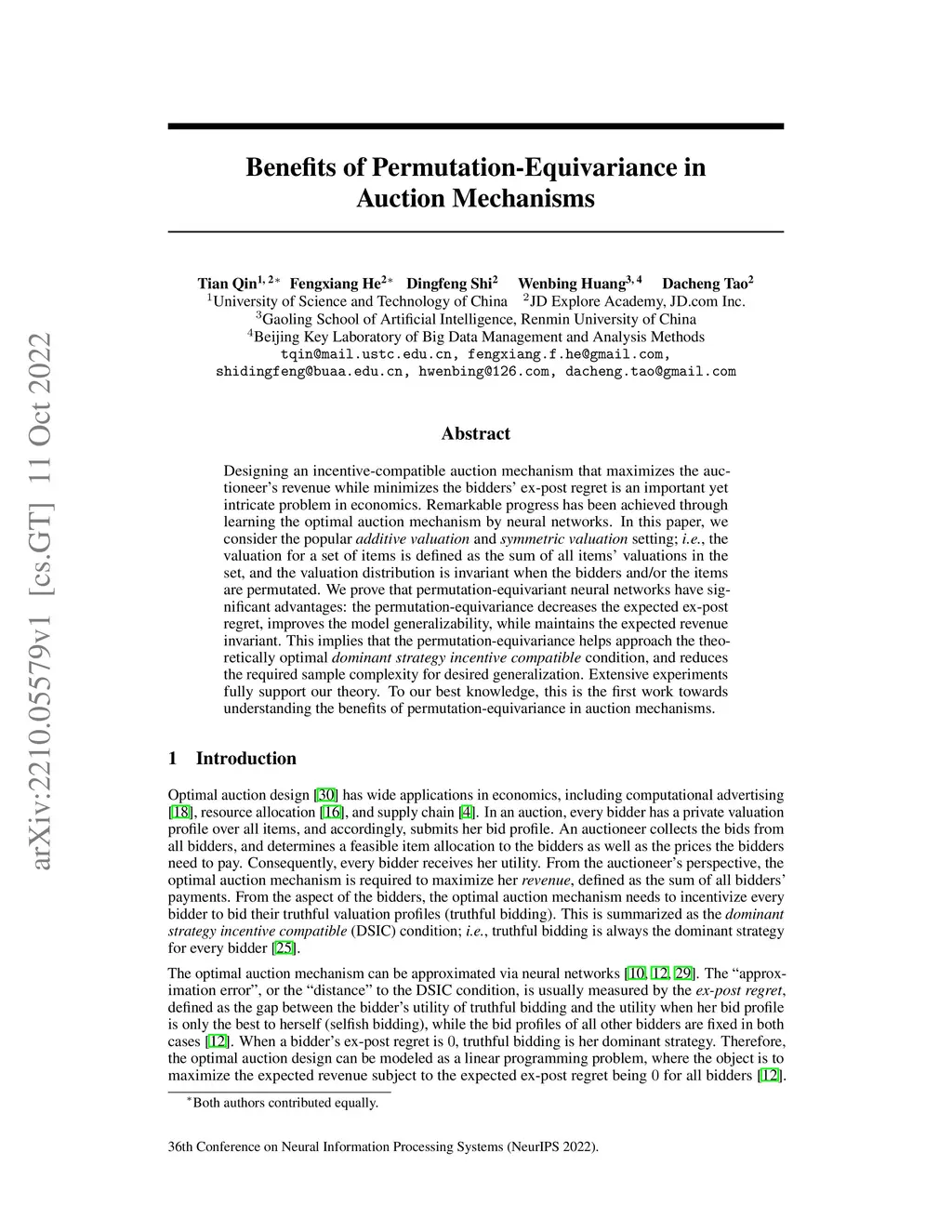 Designing an incentive-compatible auction mechanism that maximizes the auctioneer's revenue while minimizes the bidders' ex-post regret is an important yet intricate problem in economics. Remarkable progress has been achieved through learning the optimal auction mechanism by neural networks. In this paper, we consider the popular additive valuation and symmetric valuation setting; i.e., the valuation for a set of items is defined as the sum of all items' valuations in the set, and the valuation distribution is invariant when the bidders and/or the items are permutated. We prove that permutation-equivariant neural networks have significant advantages: the permutation-equivariance decreases the expected ex-post regret, improves the model generalizability, while maintains the expected revenue invariant. This implies that the permutation-equivariance helps approach the theoretically optimal dominant strategy incentive compatible condition, and reduces the required sample complexity for desired generalization. Extensive experiments fully support our theory. To our best knowledge, this is the first work towards understanding the benefits of permutation-equivariance in auction mechanisms.