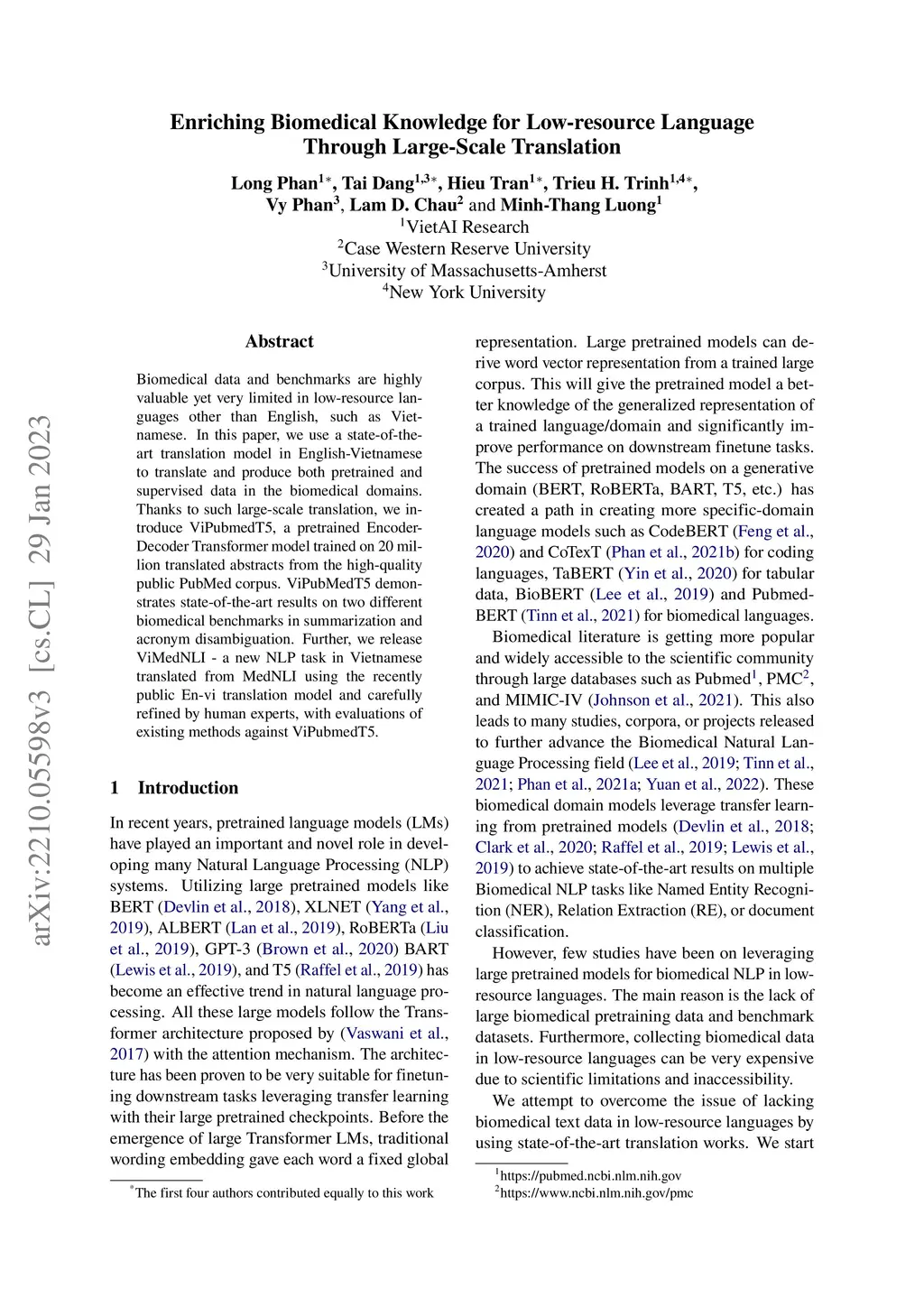 Biomedical data and benchmarks are highly valuable yet very limited in low-resource languages other than English such as Vietnamese. In this paper, we make use of a state-of-the-art translation model in English-Vietnamese to translate and produce both pretrained as well as supervised data in the biomedical domains. Thanks to such large-scale translation, we introduce ViPubmedT5, a pretrained Encoder-Decoder Transformer model trained on 20 million translated abstracts from the high-quality public PubMed corpus. ViPubMedT5 demonstrates state-of-the-art results on two different biomedical benchmarks in summarization and acronym disambiguation. Further, we release ViMedNLI - a new NLP task in Vietnamese translated from MedNLI using the recently public En-vi translation model and carefully refined by human experts, with evaluations of existing methods against ViPubmedT5.