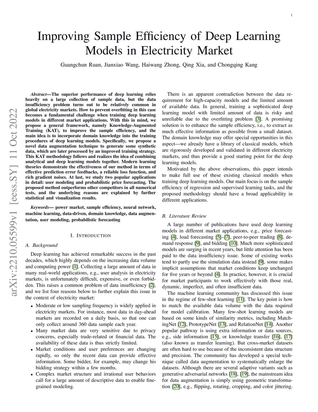 The superior performance of deep learning relies heavily on a large collection of sample data, but the data insufficiency problem turns out to be relatively common in global electricity markets. How to prevent overfitting in this case becomes a fundamental challenge when training deep learning models in different market applications. With this in mind, we propose a general framework, namely Knowledge-Augmented Training (KAT), to improve the sample efficiency, and the main idea is to incorporate domain knowledge into the training procedures of deep learning models. Specifically, we propose a novel data augmentation technique to generate some synthetic data, which are later processed by an improved training strategy. This KAT methodology follows and realizes the idea of combining analytical and deep learning models together. Modern learning theories demonstrate the effectiveness of our method in terms of effective prediction error feedbacks, a reliable loss function, and rich gradient noises. At last, we study two popular applications in detail: user modeling and probabilistic price forecasting. The proposed method outperforms other competitors in all numerical tests, and the underlying reasons are explained by further statistical and visualization results.