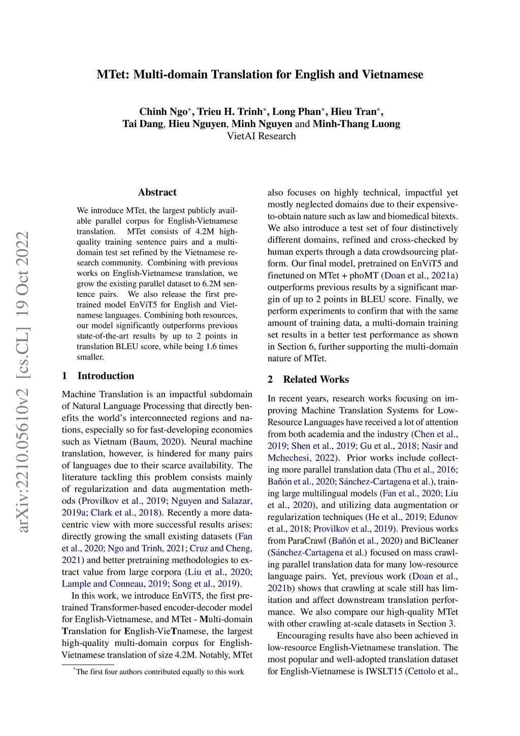 We introduce MTet, the largest publicly available parallel corpus for English-Vietnamese translation. MTet consists of 4.2M high-quality training sentence pairs and a multi-domain test set refined by the Vietnamese research community. Combining with previous works on English-Vietnamese translation, we grow the existing parallel dataset to 6.2M sentence pairs. We also release the first pretrained model EnViT5 for English and Vietnamese languages. Combining both resources, our model significantly outperforms previous state-of-the-art results by up to 2 points in translation BLEU score, while being 1.6 times smaller.