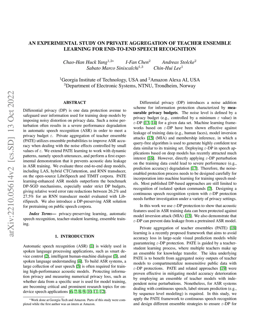 Differential privacy (DP) is one data protection avenue to safeguard user information used for training deep models by imposing noisy distortion on privacy data. Such a noise perturbation often results in a severe performance degradation in automatic speech recognition (ASR) in order to meet a privacy budget . Private aggregation of teacher ensemble (PATE) utilizes ensemble probabilities to improve ASR accuracy when dealing with the noise effects controlled by small values of . We extend PATE learning to work with dynamic patterns, namely speech utterances, and perform a first experimental demonstration that it prevents acoustic data leakage in ASR training. We evaluate three end-to-end deep models, including LAS, hybrid CTC/attention, and RNN transducer, on the open-source LibriSpeech and TIMIT corpora. PATE learning-enhanced ASR models outperform the benchmark DP-SGD mechanisms, especially under strict DP budgets, giving relative word error rate reductions between 26.2% and 27.5% for an RNN transducer model evaluated with LibriSpeech. We also introduce a DP-preserving ASR solution for pretraining on public speech corpora.
