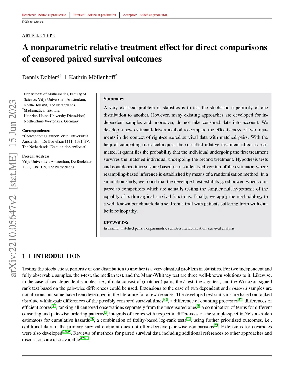 A very classical problem in statistics is to test the stochastic superiority of one distribution to another. However, many existing approaches are developed for independent samples and, moreover, do not take censored data into account. We develop a new estimand-driven method to compare the effectiveness of two treatments in the context of right-censored survival data with matched pairs. With the help of competing risks techniques, the so-called relative treatment effect is estimated. It quantifies the probability that the individual undergoing the first treatment survives the matched individual undergoing the second treatment. Hypothesis tests and confidence intervals are based on a studentized version of the estimator, where resampling-based inference is established by means of a randomization method. In a simulation study, we found that the developed test exhibits good power, when compared to competitors which are actually testing the simpler null hypothesis of the equality of both marginal survival functions. Finally, we apply the methodology to a well-known benchmark data set from a trial with patients suffering from with diabetic retinopathy.