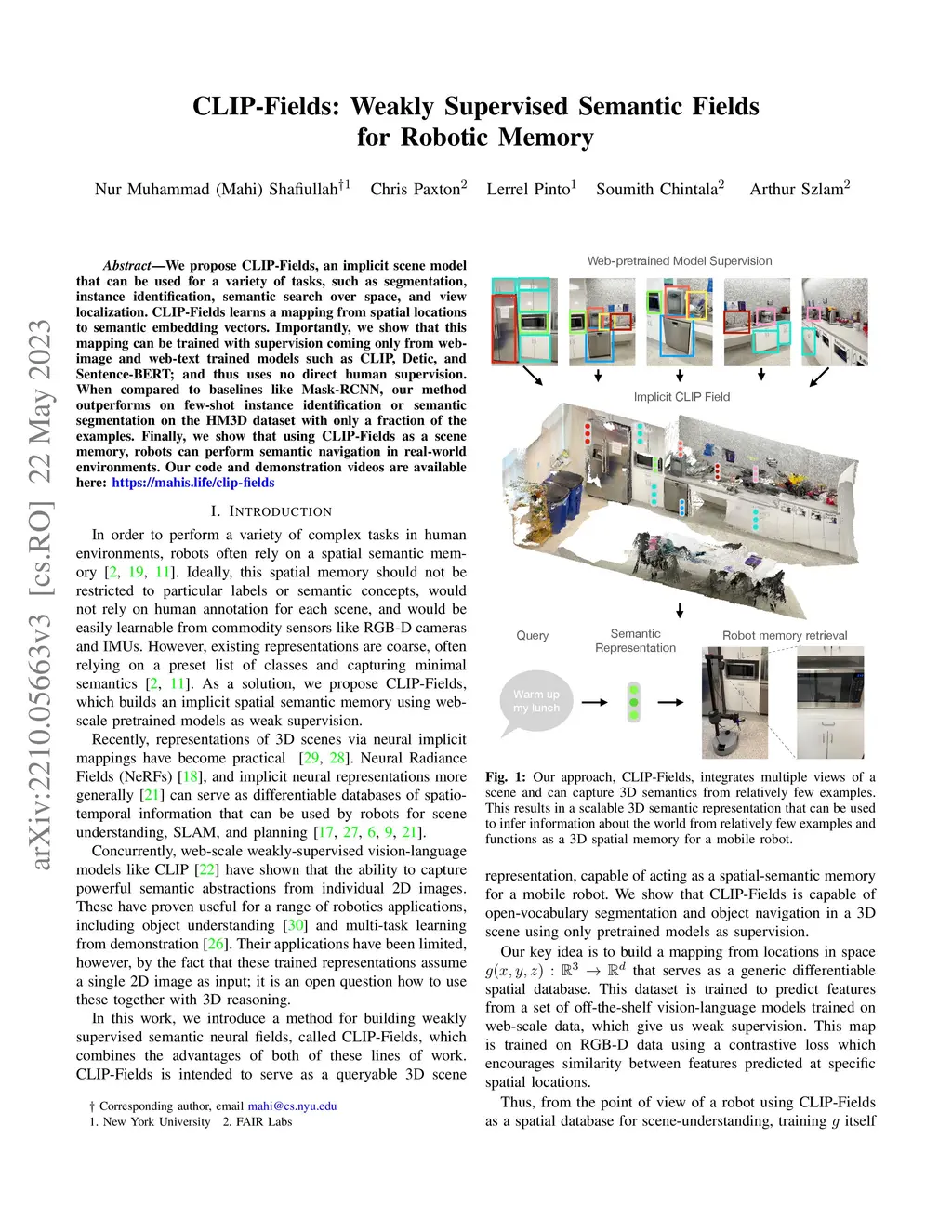 CLIP-Fields: Weakly Supervised Semantic Fields for Robotic Memory