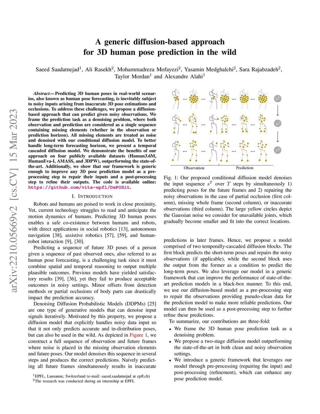 Predicting 3D human poses in real-world scenarios, also known as human pose forecasting, is inevitably subject to noisy inputs arising from inaccurate 3D pose estimations and occlusions. To address these challenges, we propose a diffusion-based approach that can predict given noisy observations. We frame the prediction task as a denoising problem, where both observation and prediction are considered as a single sequence containing missing elements (whether in the observation or prediction horizon). All missing elements are treated as noise and denoised with our conditional diffusion model. To better handle long-term forecasting horizon, we present a temporal cascaded diffusion model. We demonstrate the benefits of our approach on four publicly available datasets (Human3.6M, HumanEva-I, AMASS, and 3DPW), outperforming the state-of-the-art. Additionally, we show that our framework is generic enough to improve any 3D pose prediction model as a pre-processing step to repair their inputs and a post-processing step to refine their outputs. The code is available online: \url{https://github.com/vita-epfl/DePOSit}.
