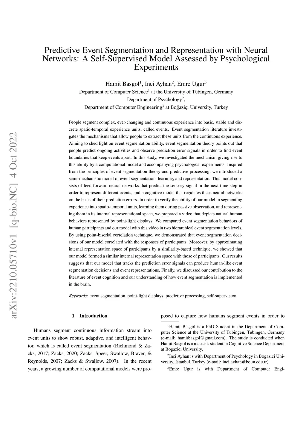 People segment complex, ever-changing and continuous experience into basic, stable and discrete spatio-temporal experience units, called events. Event segmentation literature investigates the mechanisms that allow people to extract events. Event segmentation theory points out that people predict ongoing activities and observe prediction error signals to find event boundaries that keep events apart. In this study, we investigated the mechanism giving rise to this ability by a computational model and accompanying psychological experiments. Inspired from event segmentation theory and predictive processing, we introduced a self-supervised model of event segmentation. This model consists of neural networks that predict the sensory signal in the next time-step to represent different events, and a cognitive model that regulates these networks on the basis of their prediction errors. In order to verify the ability of our model in segmenting events, learning them during passive observation, and representing them in its internal representational space, we prepared a video that depicts human behaviors represented by point-light displays. We compared event segmentation behaviors of participants and our model with this video in two hierarchical event segmentation levels. By using point-biserial correlation technique, we demonstrated that event segmentation decisions of our model correlated with the responses of participants. Moreover, by approximating representation space of participants by a similarity-based technique, we showed that our model formed a similar representation space with those of participants. The result suggests that our model that tracks the prediction error signals can produce human-like event boundaries and event representations. Finally, we discussed our contribution to the literature of event cognition and our understanding of how event segmentation is implemented in the brain.