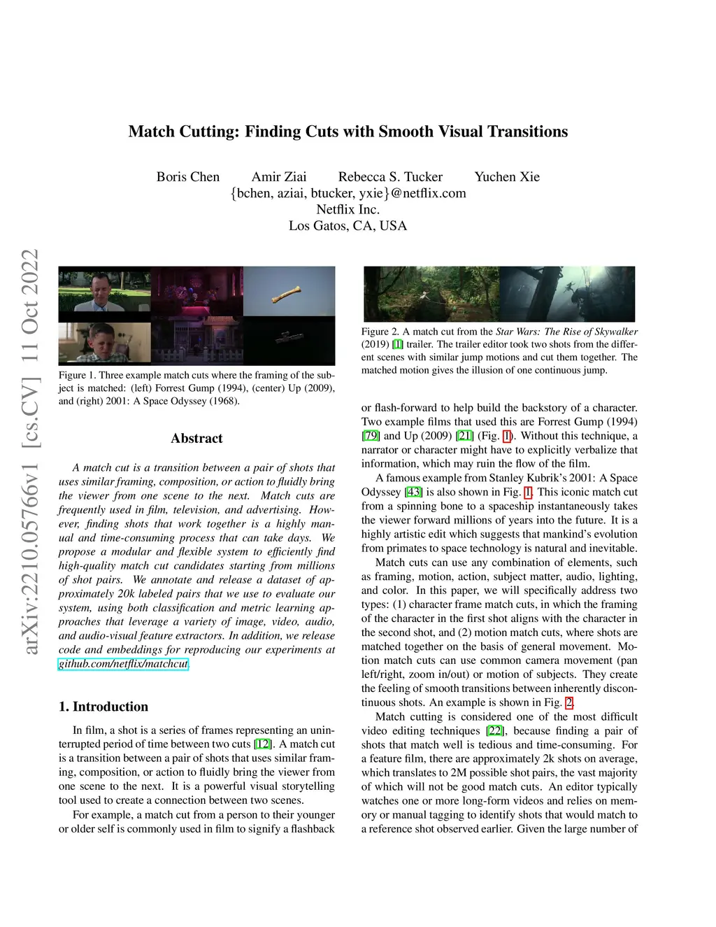 A match cut is a transition between a pair of shots that uses similar framing, composition, or action to fluidly bring the viewer from one scene to the next. Match cuts are frequently used in film, television, and advertising. However, finding shots that work together is a highly manual and time-consuming process that can take days. We propose a modular and flexible system to efficiently find high-quality match cut candidates starting from millions of shot pairs. We annotate and release a dataset of approximately 20k labeled pairs that we use to evaluate our system, using both classification and metric learning approaches that leverage a variety of image, video, audio, and audio-visual feature extractors. In addition, we release code and embeddings for reproducing our experiments at github.com/netflix/matchcut.