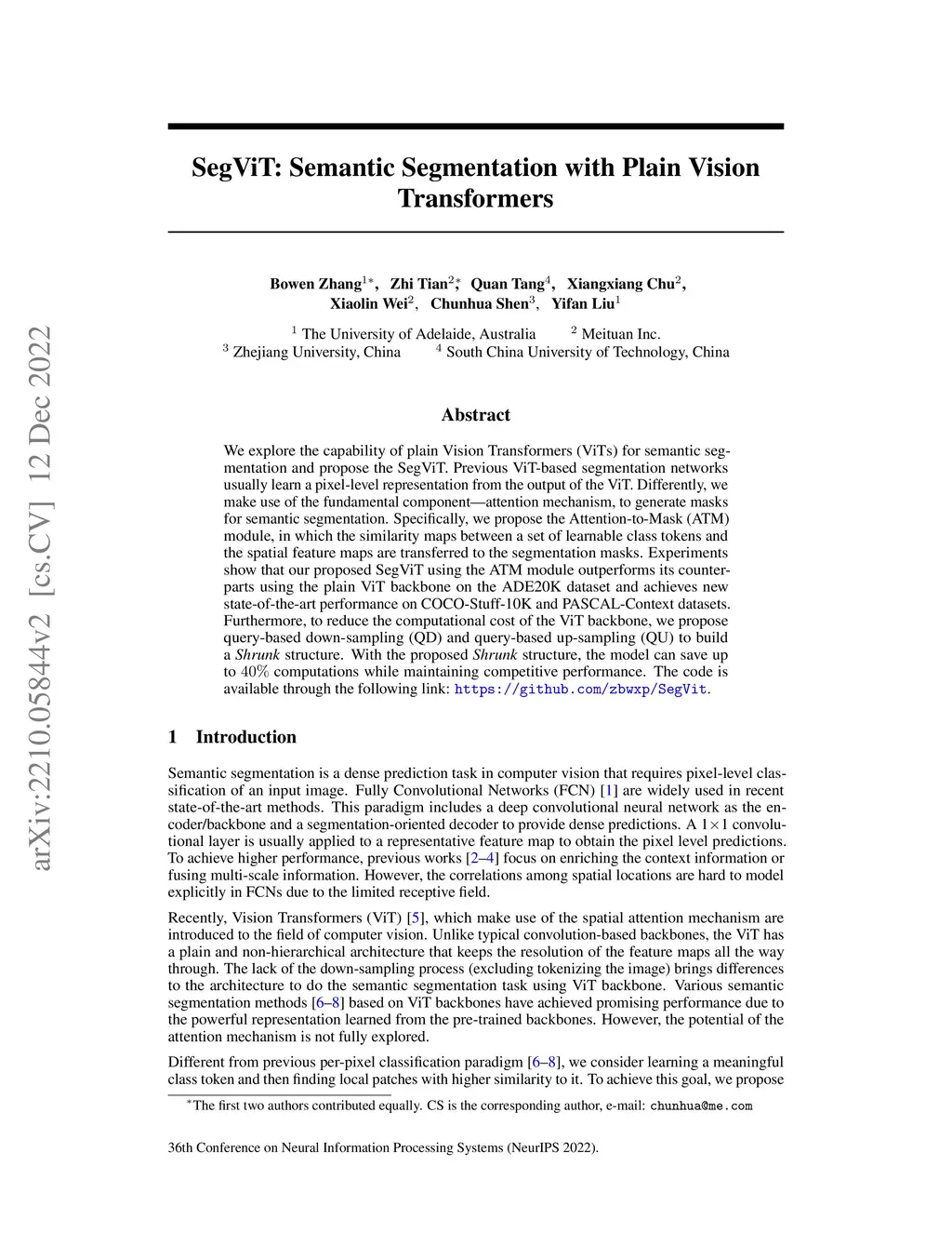 We explore the capability of plain Vision Transformers (ViTs) for semantic segmentation and propose the SegVit. Previous ViT-based segmentation networks usually learn a pixel-level representation from the output of the ViT. Differently, we make use of the fundamental component -- attention mechanism, to generate masks for semantic segmentation. Specifically, we propose the Attention-to-Mask (ATM) module, in which the similarity maps between a set of learnable class tokens and the spatial feature maps are transferred to the segmentation masks. Experiments show that our proposed SegVit using the ATM module outperforms its counterparts using the plain ViT backbone on the ADE20K dataset and achieves new state-of-the-art performance on COCO-Stuff-10K and PASCAL-Context datasets. Furthermore, to reduce the computational cost of the ViT backbone, we propose query-based down-sampling (QD) and query-based up-sampling (QU) to build a Shrunk structure. With the proposed Shrunk structure, the model can save up to computations while maintaining competitive performance.