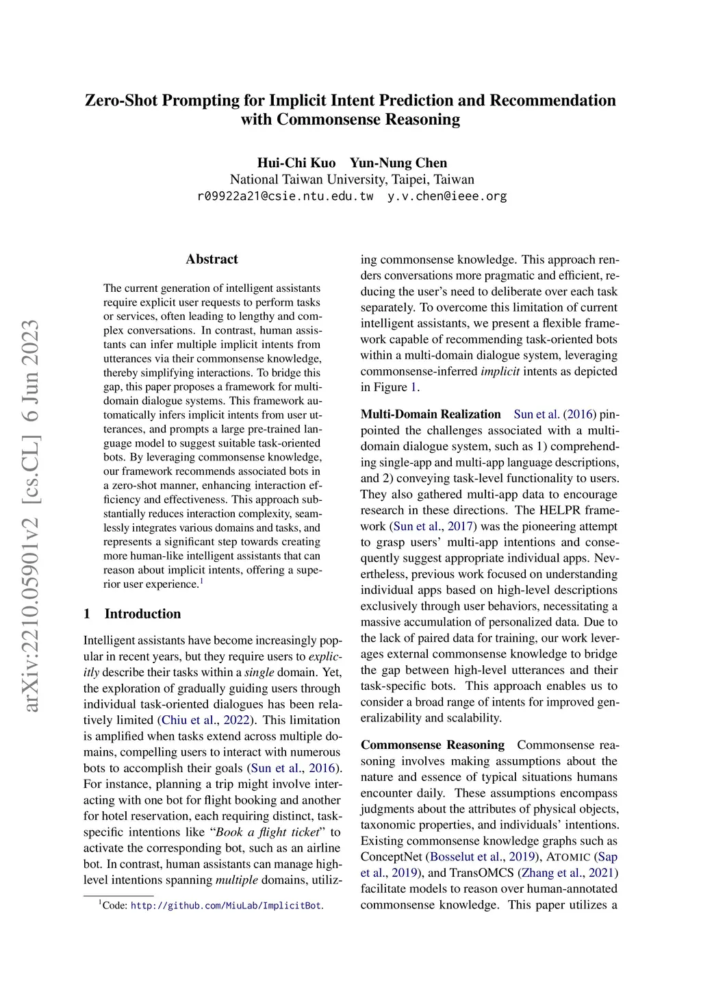 Intelligent virtual assistants are currently designed to perform tasks or services explicitly mentioned by users, so multiple related domains or tasks need to be performed one by one through a long conversation with many explicit intents. Instead, human assistants are capable of reasoning (multiple) implicit intents based on user utterances via commonsense knowledge, reducing complex interactions and improving practicality. Therefore, this paper proposes a framework of multi-domain dialogue systems, which can automatically infer implicit intents based on user utterances and then perform zero-shot prompting using a large pre-trained language model to trigger suitable single task-oriented bots. The proposed framework is demonstrated effective to realize implicit intents and recommend associated bots in a zero-shot manner.