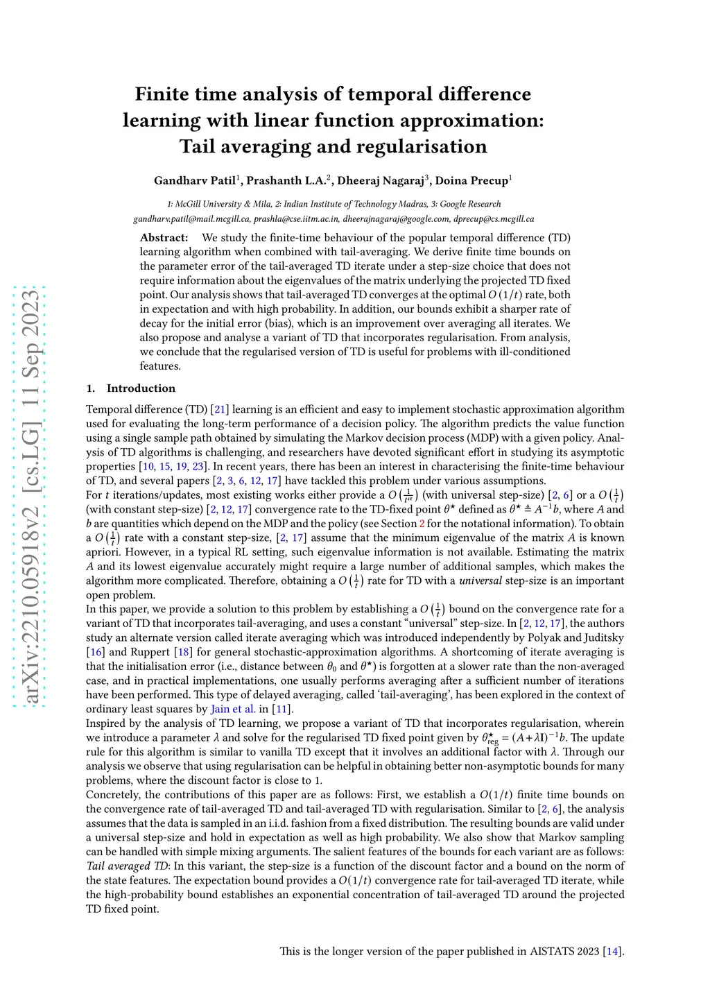 We study the finite-time behaviour of the popular temporal difference (TD) learning algorithm when combined with tail-averaging. We derive finite time bounds on the parameter error of the tail-averaged TD iterate under a step-size choice that does not require information about the eigenvalues of the matrix underlying the projected TD fixed point. Our analysis shows that tail-averaged TD converges at the optimal rate, both in expectation and with high probability. In addition, our bounds exhibit a sharper rate of decay for the initial error (bias), which is an improvement over averaging all iterates. We also propose and analyse a variant of TD that incorporates regularisation. From analysis, we conclude that the regularised version of TD is useful for problems with ill-conditioned features.