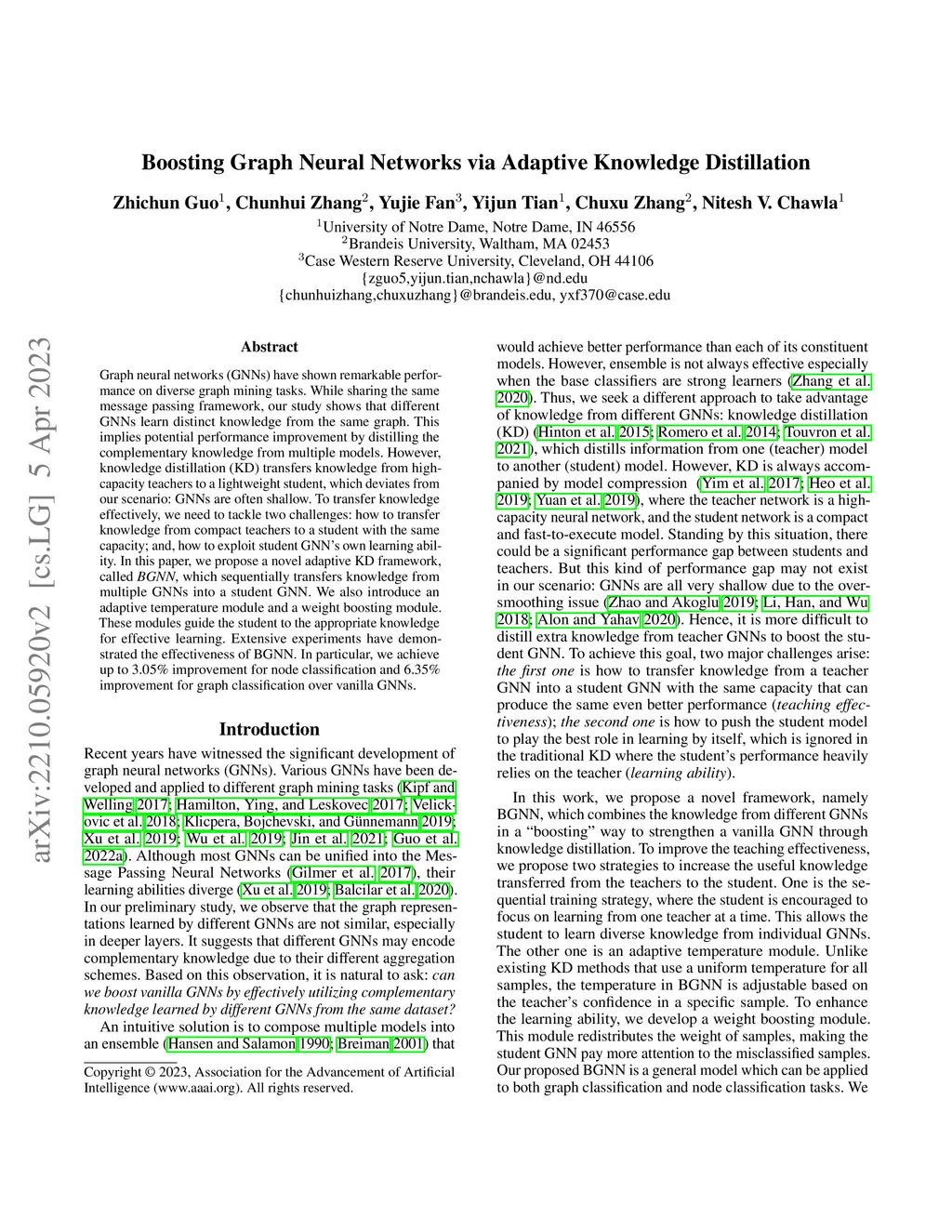Graph neural networks (GNNs) have shown remarkable performance on diverse graph mining tasks. Although different GNNs can be unified as the same message passing framework, they learn complementary knowledge from the same graph. Knowledge distillation (KD) is developed to combine the diverse knowledge from multiple models. It transfers knowledge from high-capacity teachers to a lightweight student. However, to avoid oversmoothing, GNNs are often shallow, which deviates from the setting of KD. In this context, we revisit KD by separating its benefits from model compression and emphasizing its power of transferring knowledge. To this end, we need to tackle two challenges: how to transfer knowledge from compact teachers to a student with the same capacity; and, how to exploit student GNN's own strength to learn knowledge. In this paper, we propose a novel adaptive KD framework, called BGNN, which sequentially transfers knowledge from multiple GNNs into a student GNN. We also introduce an adaptive temperature module and a weight boosting module. These modules guide the student to the appropriate knowledge for effective learning. Extensive experiments have demonstrated the effectiveness of BGNN. In particular, we achieve up to 3.05% improvement for node classification and 6.35% improvement for graph classification over vanilla GNNs.