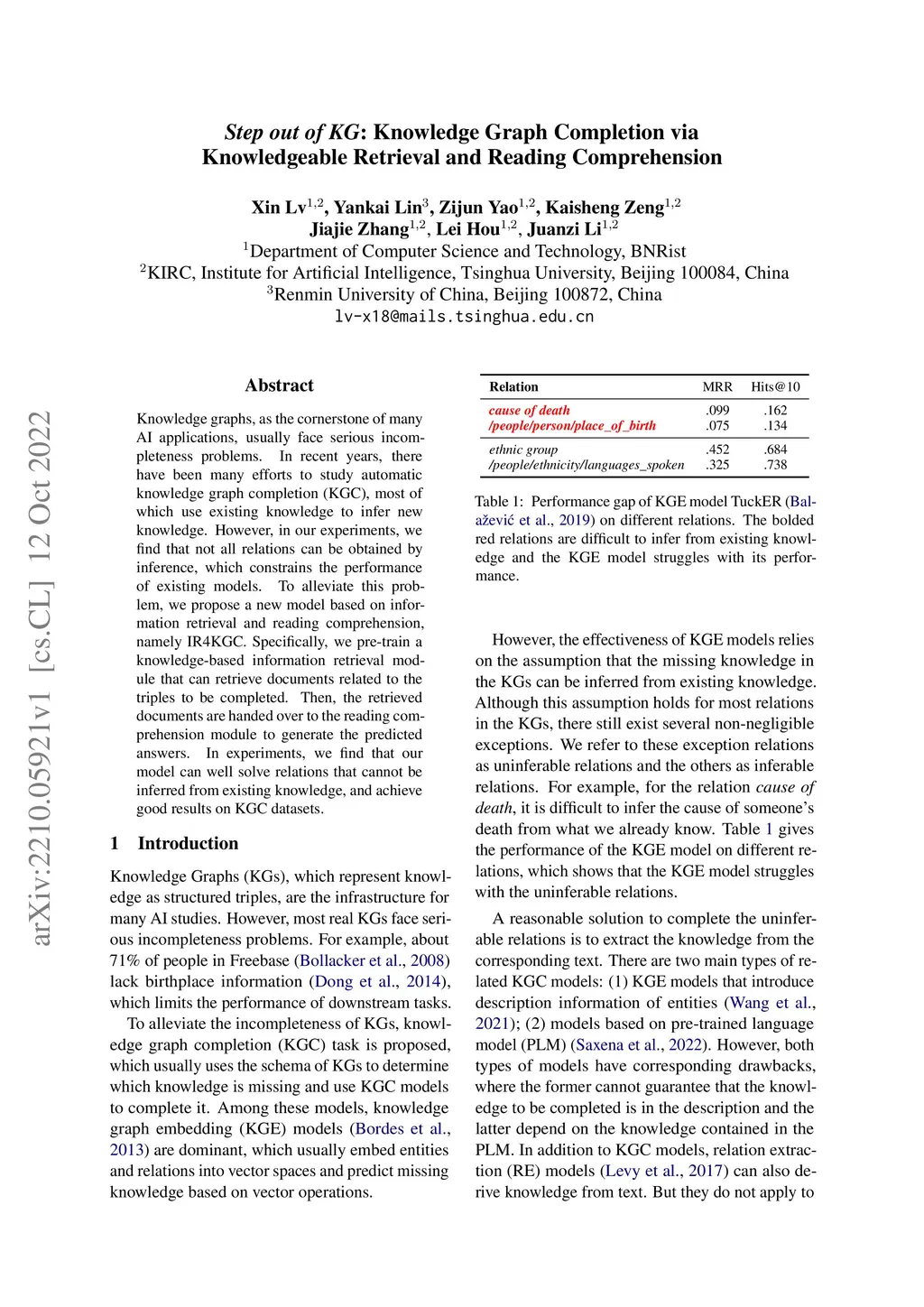 Knowledge graphs, as the cornerstone of many AI applications, usually face serious incompleteness problems. In recent years, there have been many efforts to study automatic knowledge graph completion (KGC), most of which use existing knowledge to infer new knowledge. However, in our experiments, we find that not all relations can be obtained by inference, which constrains the performance of existing models. To alleviate this problem, we propose a new model based on information retrieval and reading comprehension, namely IR4KGC. Specifically, we pre-train a knowledge-based information retrieval module that can retrieve documents related to the triples to be completed. Then, the retrieved documents are handed over to the reading comprehension module to generate the predicted answers. In experiments, we find that our model can well solve relations that cannot be inferred from existing knowledge, and achieve good results on KGC datasets.