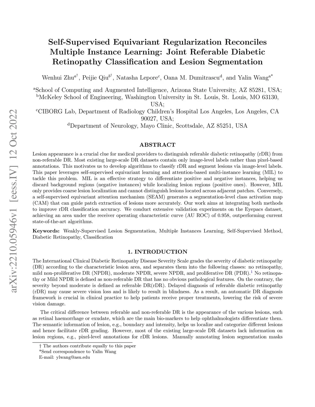 Lesion appearance is a crucial clue for medical providers to distinguish referable diabetic retinopathy (rDR) from non-referable DR. Most existing large-scale DR datasets contain only image-level labels rather than pixel-based annotations. This motivates us to develop algorithms to classify rDR and segment lesions via image-level labels. This paper leverages self-supervised equivariant learning and attention-based multi-instance learning (MIL) to tackle this problem. MIL is an effective strategy to differentiate positive and negative instances, helping us discard background regions (negative instances) while localizing lesion regions (positive ones). However, MIL only provides coarse lesion localization and cannot distinguish lesions located across adjacent patches. Conversely, a self-supervised equivariant attention mechanism (SEAM) generates a segmentation-level class activation map (CAM) that can guide patch extraction of lesions more accurately. Our work aims at integrating both methods to improve rDR classification accuracy. We conduct extensive validation experiments on the Eyepacs dataset, achieving an area under the receiver operating characteristic curve (AU ROC) of 0.958, outperforming current state-of-the-art algorithms.