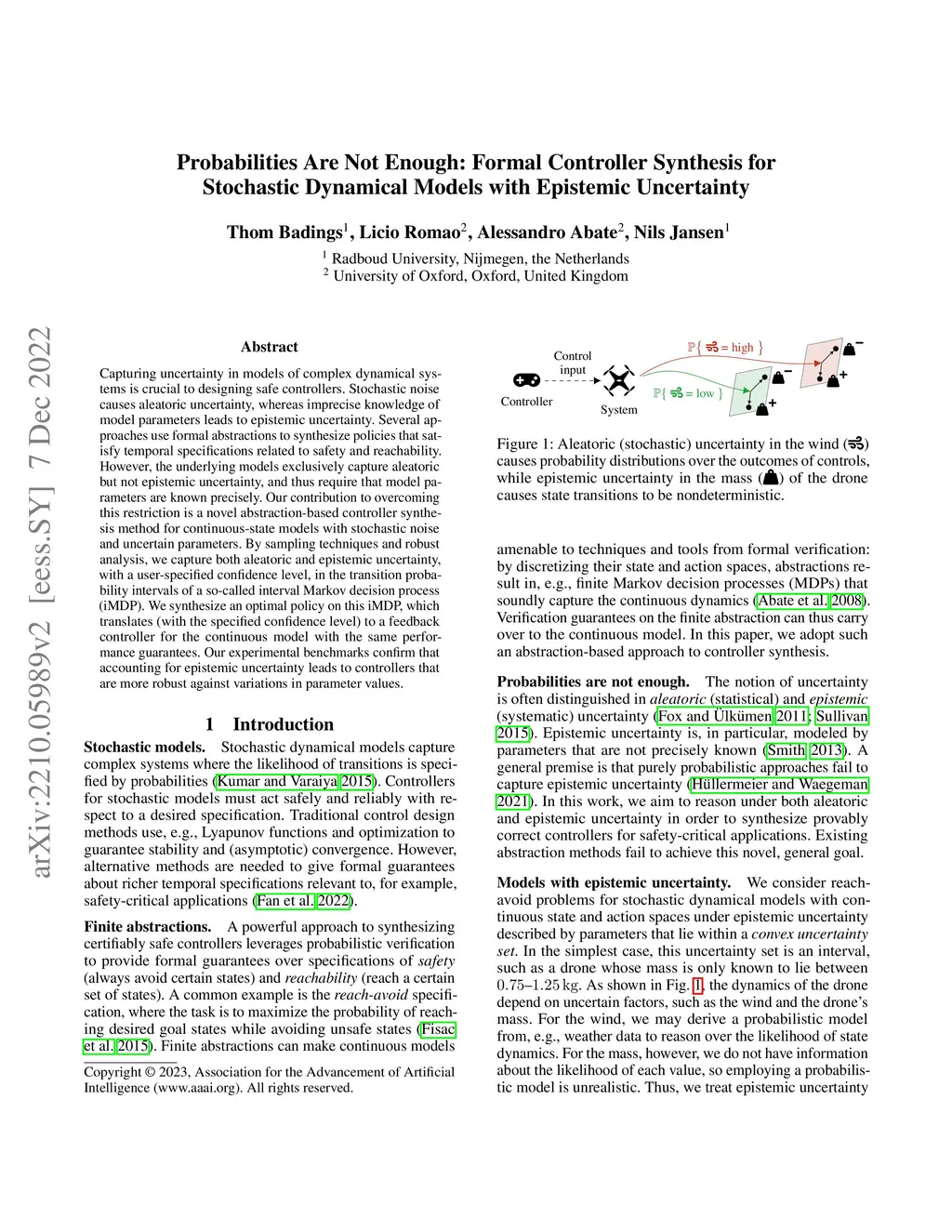 Capturing uncertainty in models of complex dynamical systems is crucial to designing safe controllers. Stochastic noise causes aleatoric uncertainty, whereas imprecise knowledge of model parameters leads to epistemic uncertainty. Several approaches use formal abstractions to synthesize policies that satisfy temporal specifications related to safety and reachability. However, the underlying models exclusively capture aleatoric but not epistemic uncertainty, and thus require that model parameters are known precisely. Our contribution to overcoming this restriction is a novel abstraction-based controller synthesis method for continuous-state models with stochastic noise and uncertain parameters. By sampling techniques and robust analysis, we capture both aleatoric and epistemic uncertainty, with a user-specified confidence level, in the transition probability intervals of a so-called interval Markov decision process (iMDP). We synthesize an optimal policy on this iMDP, which translates (with the specified confidence level) to a feedback controller for the continuous model with the same performance guarantees. Our experimental benchmarks confirm that accounting for epistemic uncertainty leads to controllers that are more robust against variations in parameter values.
