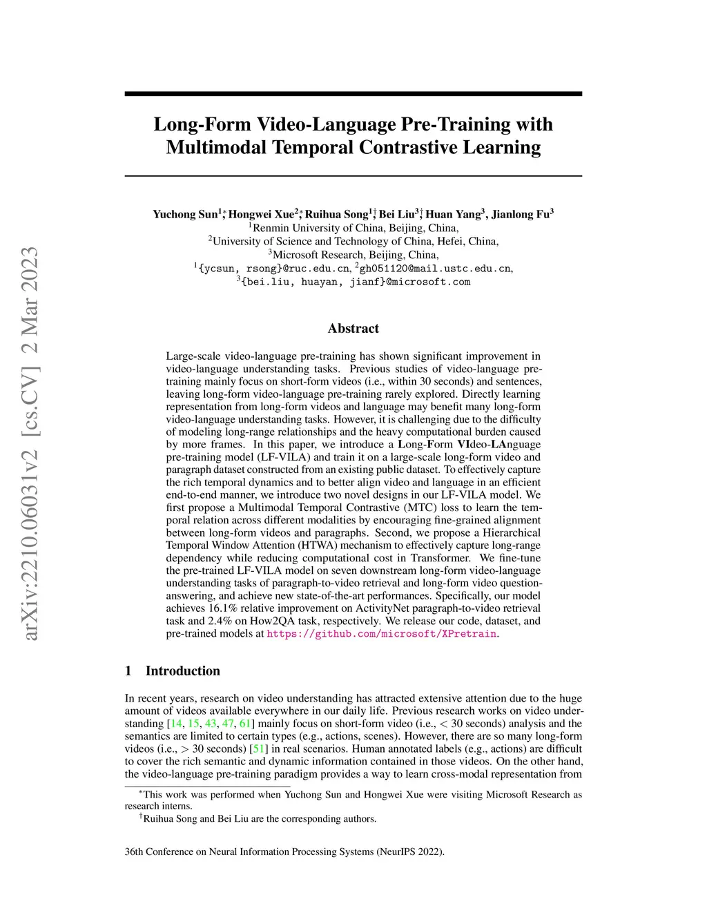 Large-scale video-language pre-training has shown significant improvement in video-language understanding tasks. Previous studies of video-language pretraining mainly focus on short-form videos (i.e., within 30 seconds) and sentences, leaving long-form video-language pre-training rarely explored. Directly learning representation from long-form videos and language may benefit many long-form video-language understanding tasks. However, it is challenging due to the difficulty of modeling long-range relationships and the heavy computational burden caused by more frames. In this paper, we introduce a Long-Form VIdeo-LAnguage pre-training model (LF-VILA) and train it on a large-scale long-form video and paragraph dataset constructed from an existing public dataset. To effectively capture the rich temporal dynamics and to better align video and language in an efficient end-to-end manner, we introduce two novel designs in our LF-VILA model. We first propose a Multimodal Temporal Contrastive (MTC) loss to learn the temporal relation across different modalities by encouraging fine-grained alignment between long-form videos and paragraphs. Second, we propose a Hierarchical Temporal Window Attention (HTWA) mechanism to effectively capture long-range dependency while reducing computational cost in Transformer. We fine-tune the pre-trained LF-VILA model on seven downstream long-form video-language understanding tasks of paragraph-to-video retrieval and long-form video question-answering, and achieve new state-of-the-art performances. Specifically, our model achieves 16.1% relative improvement on ActivityNet paragraph-to-video retrieval task and 2.4% on How2QA task, respectively. We release our code, dataset, and pre-trained models at https://github.com/microsoft/XPretrain.