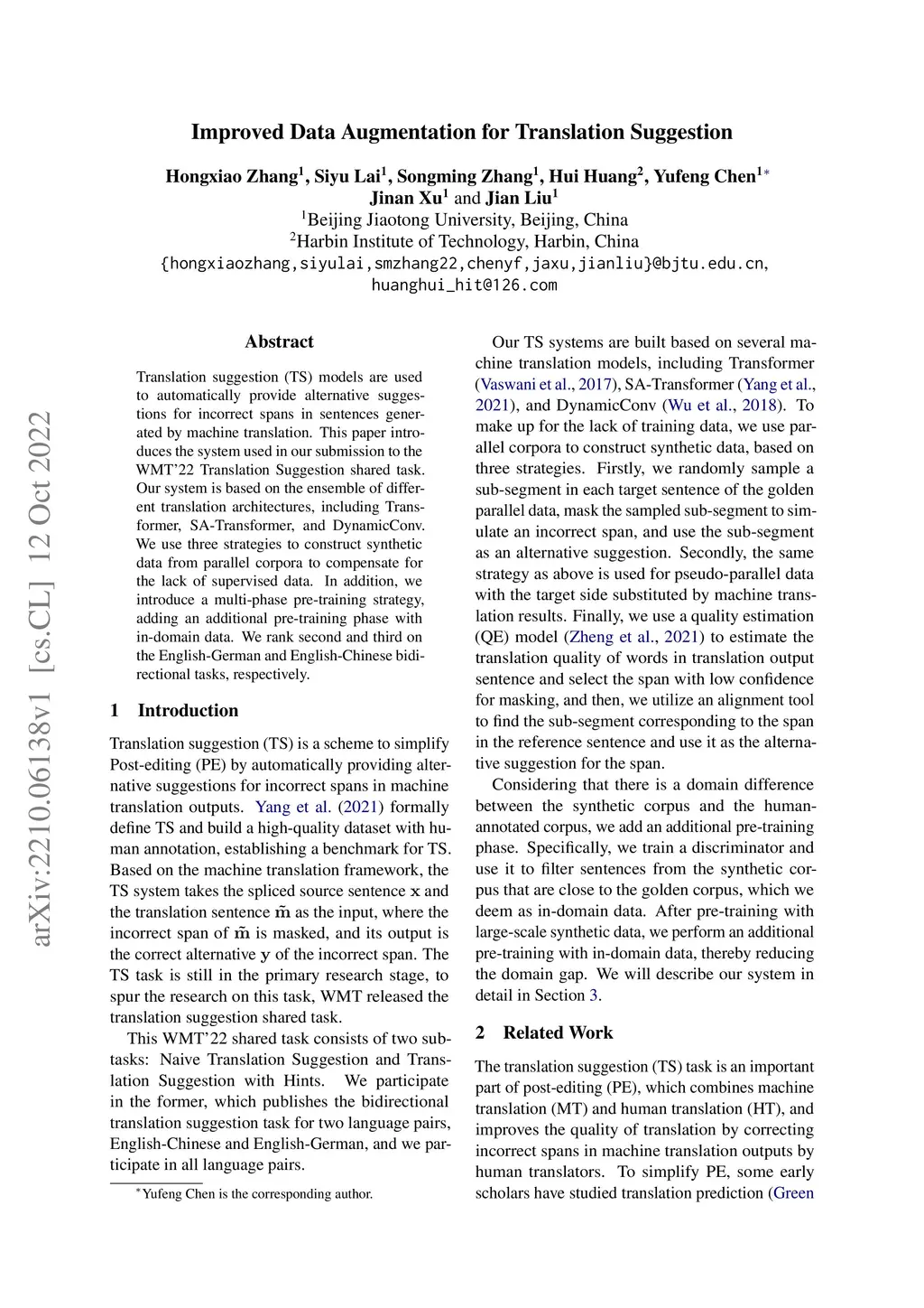 Translation suggestion (TS) models are used to automatically provide alternative suggestions for incorrect spans in sentences generated by machine translation. This paper introduces the system used in our submission to the WMT'22 Translation Suggestion shared task. Our system is based on the ensemble of different translation architectures, including Transformer, SA-Transformer, and DynamicConv. We use three strategies to construct synthetic data from parallel corpora to compensate for the lack of supervised data. In addition, we introduce a multi-phase pre-training strategy, adding an additional pre-training phase with in-domain data. We rank second and third on the English-German and English-Chinese bidirectional tasks, respectively.