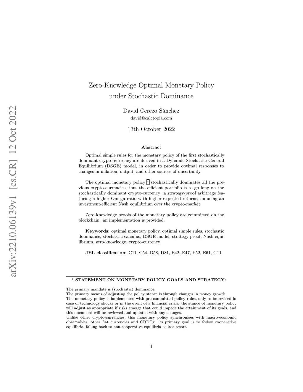 Optimal simple rules for the monetary policy of the first stochastically dominant crypto-currency are derived in a Dynamic Stochastic General Equilibrium (DSGE) model, in order to provide optimal responses to changes in inflation, output, and other sources of uncertainty. The optimal monetary policy stochastically dominates all the previous crypto-currencies, thus the efficient portfolio is to go long on the stochastically dominant crypto-currency: a strategy-proof arbitrage featuring a higher Omega ratio with higher expected returns, inducing an investment-efficient Nash equilibrium over the crypto-market. Zero-knowledge proofs of the monetary policy are committed on the blockchain: an implementation is provided.