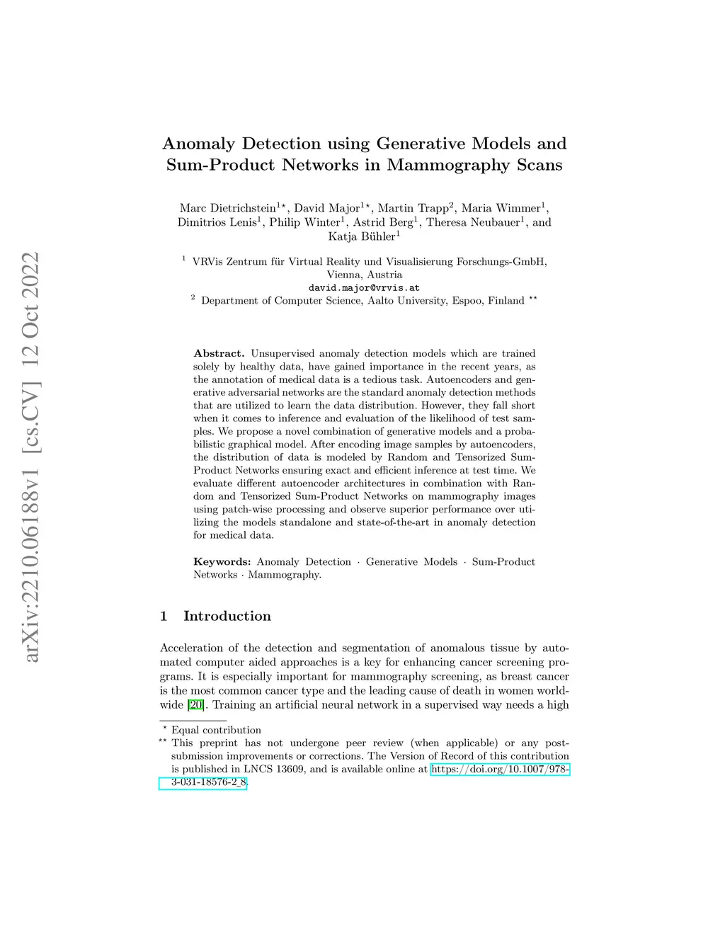 Unsupervised anomaly detection models which are trained solely by healthy data, have gained importance in the recent years, as the annotation of medical data is a tedious task. Autoencoders and generative adversarial networks are the standard anomaly detection methods that are utilized to learn the data distribution. However, they fall short when it comes to inference and evaluation of the likelihood of test samples. We propose a novel combination of generative models and a probabilistic graphical model. After encoding image samples by autoencoders, the distribution of data is modeled by Random and Tensorized Sum-Product Networks ensuring exact and efficient inference at test time. We evaluate different autoencoder architectures in combination with Random and Tensorized Sum-Product Networks on mammography images using patch-wise processing and observe superior performance over utilizing the models standalone and state-of-the-art in anomaly detection for medical data.