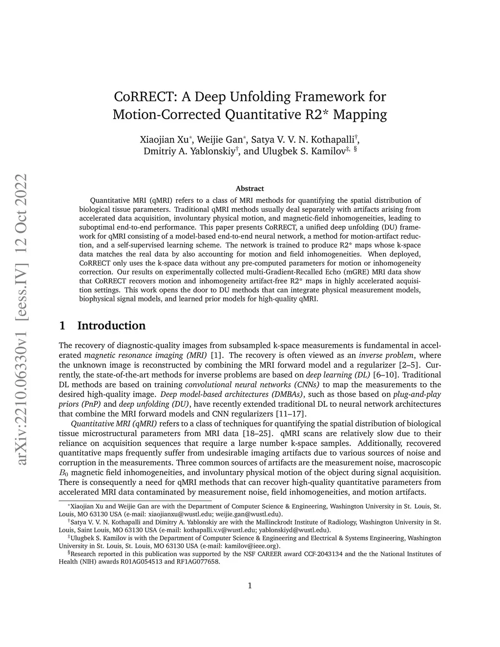 Quantitative MRI (qMRI) refers to a class of MRI methods for quantifying the spatial distribution of biological tissue parameters. Traditional qMRI methods usually deal separately with artifacts arising from accelerated data acquisition, involuntary physical motion, and magnetic-field inhomogeneities, leading to suboptimal end-to-end performance. This paper presents CoRRECT, a unified deep unfolding (DU) framework for qMRI consisting of a model-based end-to-end neural network, a method for motion-artifact reduction, and a self-supervised learning scheme. The network is trained to produce R2* maps whose k-space data matches the real data by also accounting for motion and field inhomogeneities. When deployed, CoRRECT only uses the k-space data without any pre-computed parameters for motion or inhomogeneity correction. Our results on experimentally collected multi-Gradient-Recalled Echo (mGRE) MRI data show that CoRRECT recovers motion and inhomogeneity artifact-free R2* maps in highly accelerated acquisition settings. This work opens the door to DU methods that can integrate physical measurement models, biophysical signal models, and learned prior models for high-quality qMRI.