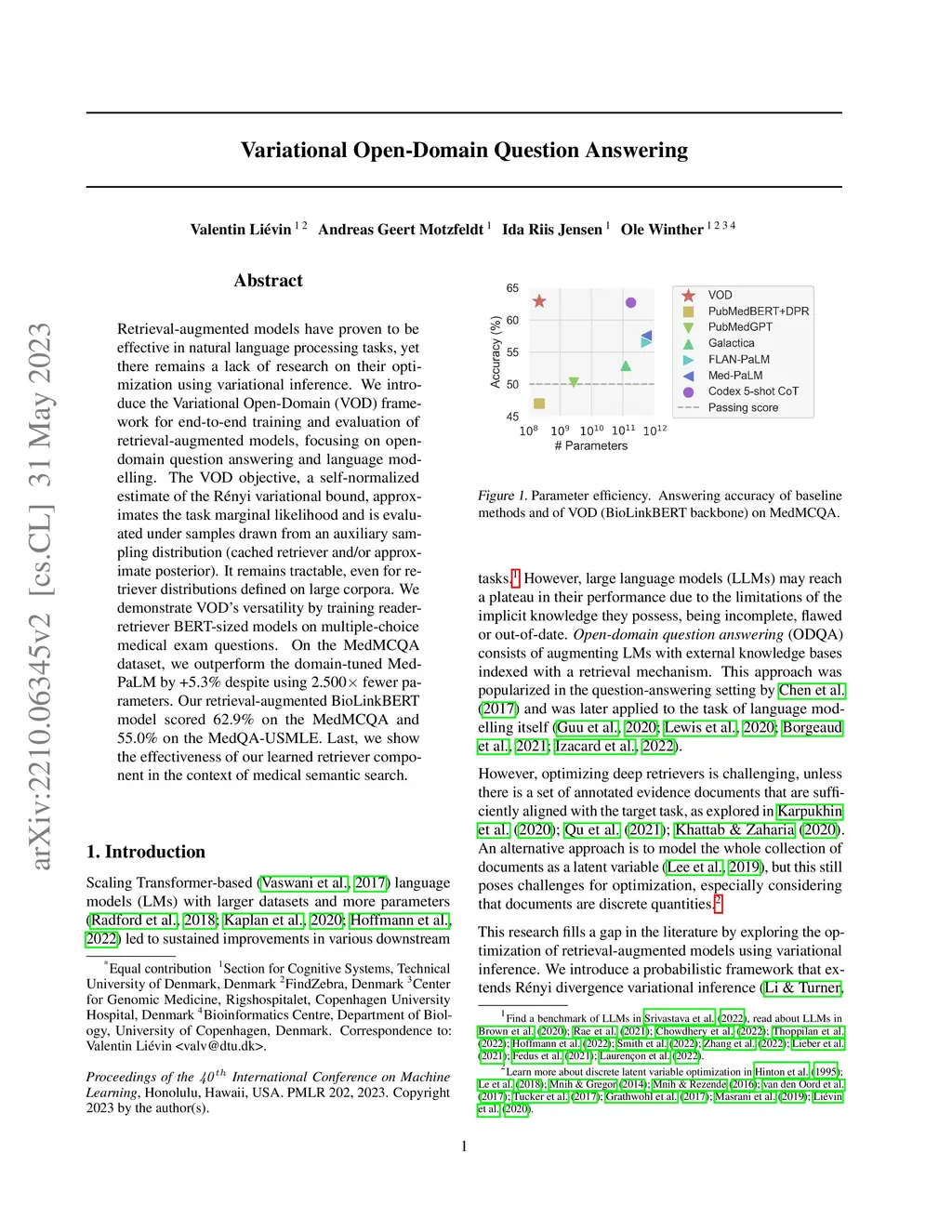 Retrieval-augmented models have proven to be effective in natural language processing tasks, yet there remains a lack of research on their optimization using variational inference. We introduce the Variational Open-Domain (VOD) framework for end-to-end training and evaluation of retrieval-augmented models, focusing on open-domain question answering and language modelling. The VOD objective, a self-normalized estimate of the R\ényi variational bound, approximates the task marginal likelihood and is evaluated under samples drawn from an auxiliary sampling distribution (cached retriever and/or approximate posterior). It remains tractable, even for retriever distributions defined on large corpora. We demonstrate VOD's versatility by training reader-retriever BERT-sized models on multiple-choice medical exam questions. On the MedMCQA dataset, we outperform the domain-tuned Med-PaLM by +5.3% despite using 2.500 fewer parameters. Our retrieval-augmented BioLinkBERT model scored 62.9% on the MedMCQA and 55.0% on the MedQA-USMLE. Last, we show the effectiveness of our learned retriever component in the context of medical semantic search.