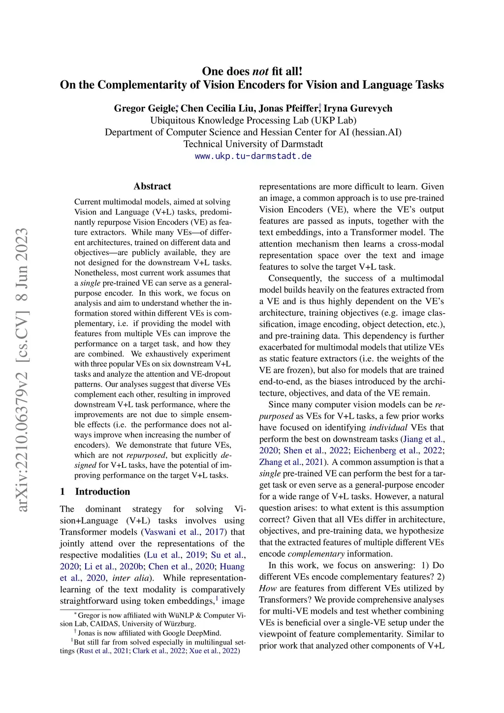 Current multimodal models, aimed at solving Vision and Language (V+L) tasks, predominantly repurpose Vision Encoders (VE) as feature extractors. While many VEs -- of different architectures, trained on different data and objectives -- are publicly available, they are not designed for the downstream V+L tasks. Nonetheless, most current work assumes that a \textit{single} pre-trained VE can serve as a general-purpose encoder. In this work, we focus on analysis and aim to understand whether the information stored within different VEs is complementary, i.e. if providing the model with features from multiple VEs can improve the performance on a target task, and how they are combined. We exhaustively experiment with three popular VEs on six downstream V+L tasks and analyze the attention and VE-dropout patterns. Our analyses suggest that diverse VEs complement each other, resulting in improved downstream V+L task performance, where the improvements are not due to simple ensemble effects (i.e. the performance does not always improve when increasing the number of encoders). We demonstrate that future VEs, which are not \textit{repurposed}, but explicitly \textit{designed} for V+L tasks, have the potential of improving performance on the target V+L tasks.