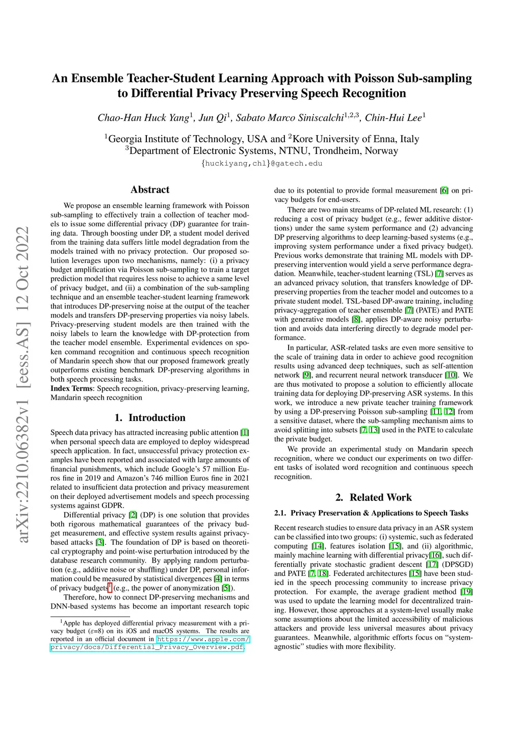We propose an ensemble learning framework with Poisson sub-sampling to effectively train a collection of teacher models to issue some differential privacy (DP) guarantee for training data. Through boosting under DP, a student model derived from the training data suffers little model degradation from the models trained with no privacy protection. Our proposed solution leverages upon two mechanisms, namely: (i) a privacy budget amplification via Poisson sub-sampling to train a target prediction model that requires less noise to achieve a same level of privacy budget, and (ii) a combination of the sub-sampling technique and an ensemble teacher-student learning framework that introduces DP-preserving noise at the output of the teacher models and transfers DP-preserving properties via noisy labels. Privacy-preserving student models are then trained with the noisy labels to learn the knowledge with DP-protection from the teacher model ensemble. Experimental evidences on spoken command recognition and continuous speech recognition of Mandarin speech show that our proposed framework greatly outperforms existing DP-preserving algorithms in both speech processing tasks.
