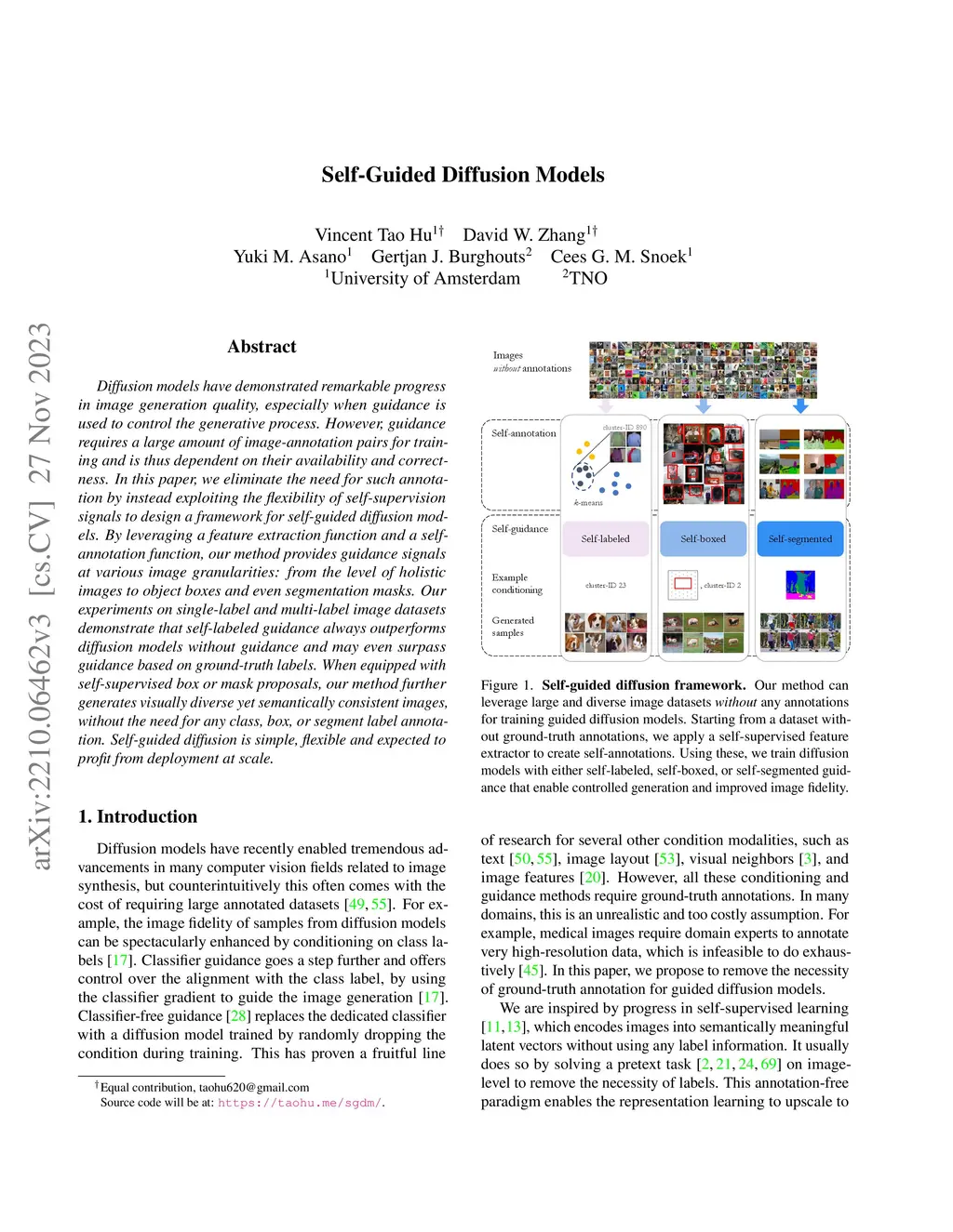 Diffusion models have demonstrated remarkable progress in image generation quality, especially when guidance is used to control the generative process. However, guidance requires a large amount of image-annotation pairs for training and is thus dependent on their availability, correctness and unbiasedness. In this paper, we eliminate the need for such annotation by instead leveraging the flexibility of self-supervision signals to design a framework for self-guided diffusion models. By leveraging a feature extraction function and a self-annotation function, our method provides guidance signals at various image granularities: from the level of holistic images to object boxes and even segmentation masks. Our experiments on single-label and multi-label image datasets demonstrate that self-labeled guidance always outperforms diffusion models without guidance and may even surpass guidance based on ground-truth labels, especially on unbalanced data. When equipped with self-supervised box or mask proposals, our method further generates visually diverse yet semantically consistent images, without the need for any class, box, or segment label annotation. Self-guided diffusion is simple, flexible and expected to profit from deployment at scale. Source code will be at: https://taohu.me/sgdm/