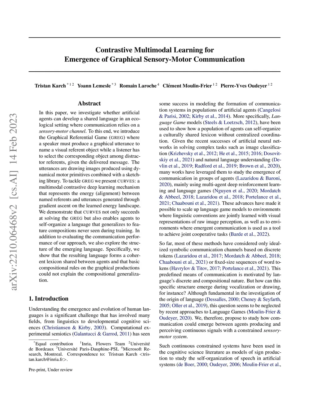 In this paper, we investigate whether artificial agents can develop a shared language in an ecological setting where communication relies on a sensory-motor channel. To this end, we introduce the Graphical Referential Game (GREG) where a speaker must produce a graphical utterance to name a visual referent object while a listener has to select the corresponding object among distractor referents, given the delivered message. The utterances are drawing images produced using dynamical motor primitives combined with a sketching library. To tackle GREG we present CURVES: a multimodal contrastive deep learning mechanism that represents the energy (alignment) between named referents and utterances generated through gradient ascent on the learned energy landscape. We demonstrate that CURVES not only succeeds at solving the GREG but also enables agents to self-organize a language that generalizes to feature compositions never seen during training. In addition to evaluating the communication performance of our approach, we also explore the structure of the emerging language. Specifically, we show that the resulting language forms a coherent lexicon shared between agents and that basic compositional rules on the graphical productions could not explain the compositional generalization.