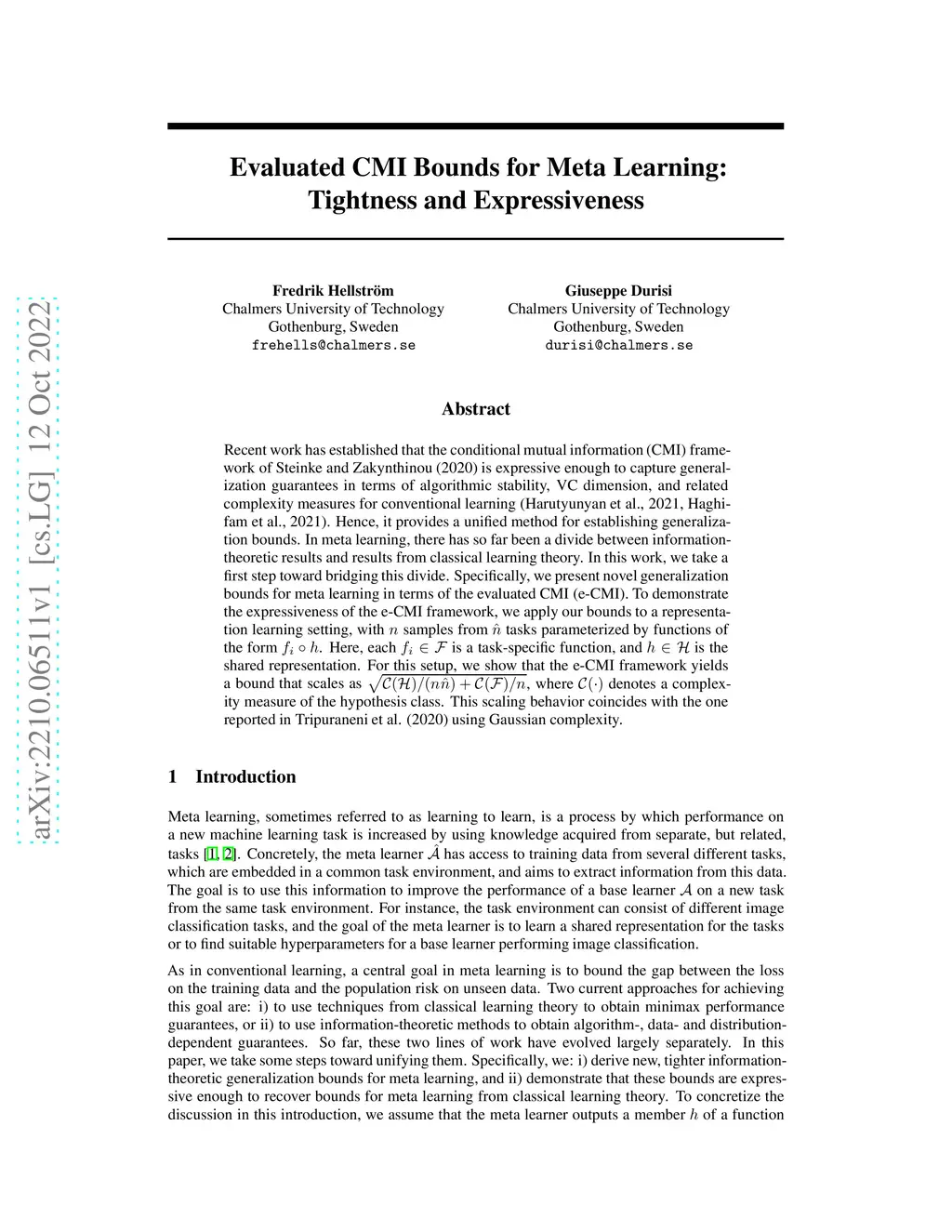 Recent work has established that the conditional mutual information (CMI) framework of Steinke and Zakynthinou (2020) is expressive enough to capture generalization guarantees in terms of algorithmic stability, VC dimension, and related complexity measures for conventional learning (Harutyunyan et al., 2021, Haghifam et al., 2021). Hence, it provides a unified method for establishing generalization bounds. In meta learning, there has so far been a divide between information-theoretic results and results from classical learning theory. In this work, we take a first step toward bridging this divide. Specifically, we present novel generalization bounds for meta learning in terms of the evaluated CMI (e-CMI). To demonstrate the expressiveness of the e-CMI framework, we apply our bounds to a representation learning setting, with samples from tasks parameterized by functions of the form . Here, each is a task-specific function, and is the shared representation. For this setup, we show that the e-CMI framework yields a bound that scales as $\sqrt{ \mathcal C(\mathcal H)/(n\hat n) + \mathcal C(\mathcal F)/n} $, where denotes a complexity measure of the hypothesis class. This scaling behavior coincides with the one reported in Tripuraneni et al. (2020) using Gaussian complexity.