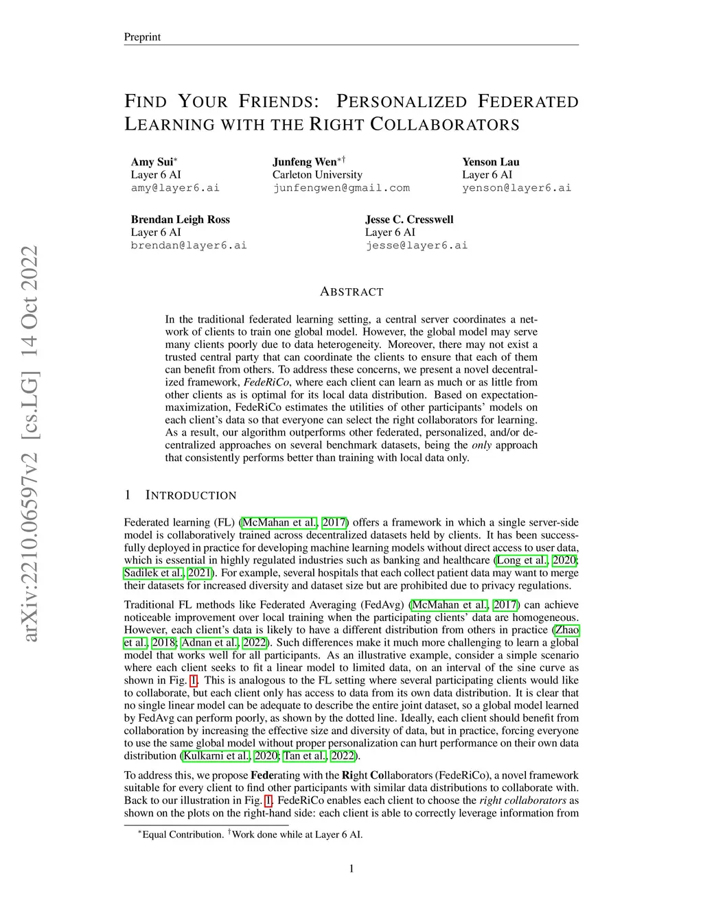 In the traditional federated learning setting, a central server coordinates a network of clients to train one global model. However, the global model may serve many clients poorly due to data heterogeneity. Moreover, there may not exist a trusted central party that can coordinate the clients to ensure that each of them can benefit from others. To address these concerns, we present a novel decentralized framework, FedeRiCo, where each client can learn as much or as little from other clients as is optimal for its local data distribution. Based on expectation-maximization, FedeRiCo estimates the utilities of other participants' models on each client's data so that everyone can select the right collaborators for learning. As a result, our algorithm outperforms other federated, personalized, and/or decentralized approaches on several benchmark datasets, being the only approach that consistently performs better than training with local data only.