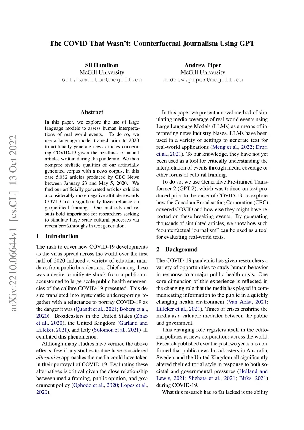 In this paper, we explore the use of large language models to assess human interpretations of real world events. To do so, we use a language model trained prior to 2020 to artificially generate news articles concerning COVID-19 given the headlines of actual articles written during the pandemic. We then compare stylistic qualities of our artificially generated corpus with a news corpus, in this case 5,082 articles produced by CBC News between January 23 and May 5, 2020. We find our artificially generated articles exhibits a considerably more negative attitude towards COVID and a significantly lower reliance on geopolitical framing. Our methods and results hold importance for researchers seeking to simulate large scale cultural processes via recent breakthroughs in text generation.