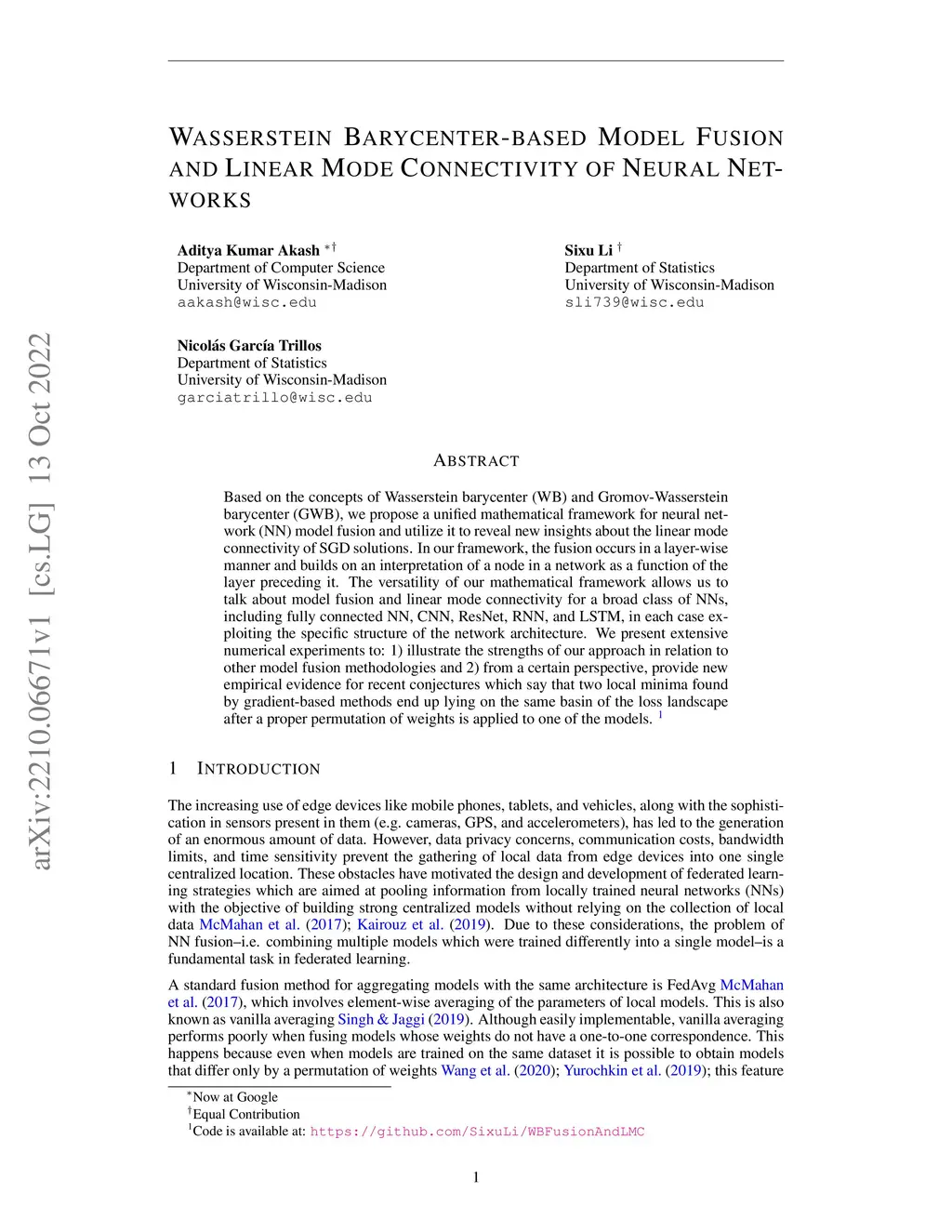 Based on the concepts of Wasserstein barycenter (WB) and Gromov-Wasserstein barycenter (GWB), we propose a unified mathematical framework for neural network (NN) model fusion and utilize it to reveal new insights about the linear mode connectivity of SGD solutions. In our framework, the fusion occurs in a layer-wise manner and builds on an interpretation of a node in a network as a function of the layer preceding it. The versatility of our mathematical framework allows us to talk about model fusion and linear mode connectivity for a broad class of NNs, including fully connected NN, CNN, ResNet, RNN, and LSTM, in each case exploiting the specific structure of the network architecture. We present extensive numerical experiments to: 1) illustrate the strengths of our approach in relation to other model fusion methodologies and 2) from a certain perspective, provide new empirical evidence for recent conjectures which say that two local minima found by gradient-based methods end up lying on the same basin of the loss landscape after a proper permutation of weights is applied to one of the models.