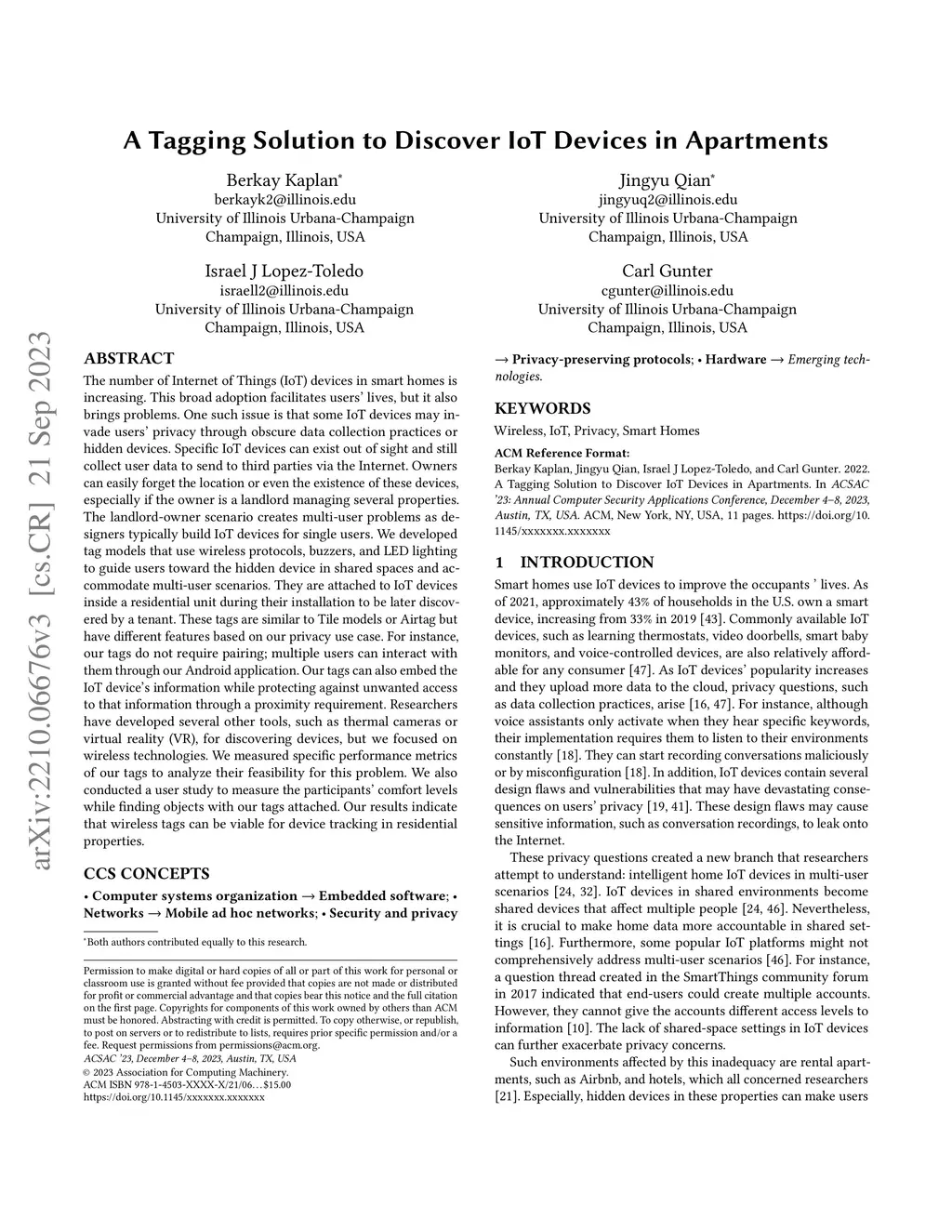 The number of IoT devices in smart homes is increasing. This broad adoption facilitates users' lives, but it also brings problems. One such issue is that some IoT devices may invade users' privacy. Some reasons for this invasion can stem from obscure data collection practices or hidden devices. Specific IoT devices can exist out of sight and still collect user data to send to third parties via the Internet. Owners can easily forget the location or even the existence of these devices, especially if the owner is a landlord who manages several properties. The landlord-owner scenario creates multi-user problems as designers build machines for single users. We developed tags that use wireless protocols, buzzers, and LED lighting to lead users to solve the issue of device discovery in shared spaces and accommodate multi-user scenarios. They are attached to IoT devices inside a unit during their installation to be later discovered by a tenant. These tags have similar functionalities as the popular Tile models or Airtag, but our tags have different features based on our privacy use case. Our tags do not require pairing; multiple users can interact with them through our Android application. Although researchers developed several other tools, such as thermal cameras or virtual reality (VR), for discovering devices in environments, they have not used wireless protocols as a solution. We measured specific performance metrics of our tags to analyze their feasibility for this problem. We also conducted a user study to measure the participants' comfort levels while finding objects with our tags attached. Our results indicate that wireless tags can be viable for device tracking in residential properties.