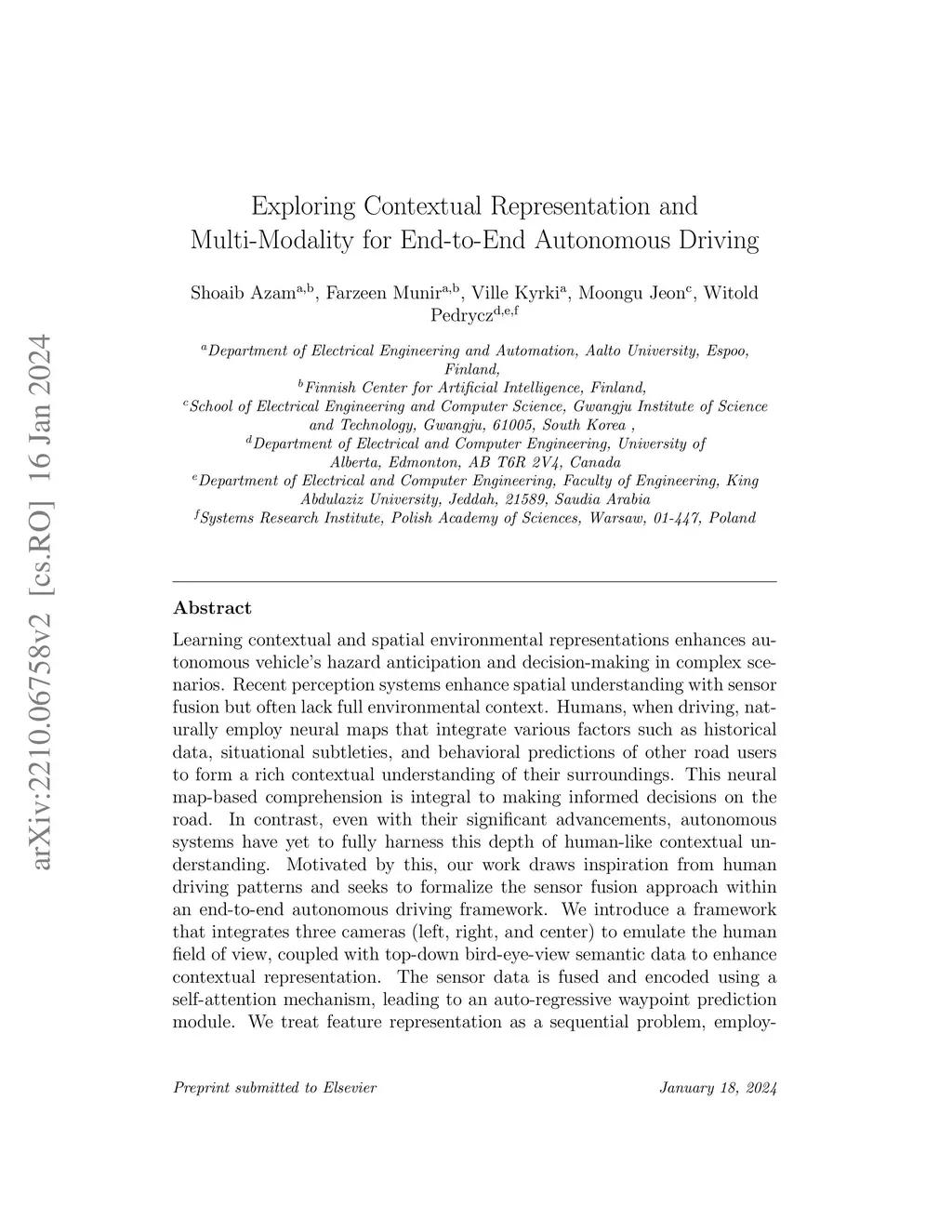 Learning contextual and spatial environmental representations enhances autonomous vehicle's hazard anticipation and decision-making in complex scenarios. Recent perception systems enhance spatial understanding with sensor fusion but often lack full environmental context. Humans, when driving, naturally employ neural maps that integrate various factors such as historical data, situational subtleties, and behavioral predictions of other road users to form a rich contextual understanding of their surroundings. This neural map-based comprehension is integral to making informed decisions on the road. In contrast, even with their significant advancements, autonomous systems have yet to fully harness this depth of human-like contextual understanding. Motivated by this, our work draws inspiration from human driving patterns and seeks to formalize the sensor fusion approach within an end-to-end autonomous driving framework. We introduce a framework that integrates three cameras (left, right, and center) to emulate the human field of view, coupled with top-down bird-eye-view semantic data to enhance contextual representation. The sensor data is fused and encoded using a self-attention mechanism, leading to an auto-regressive waypoint prediction module. We treat feature representation as a sequential problem, employing a vision transformer to distill the contextual interplay between sensor modalities. The efficacy of the proposed method is experimentally evaluated in both open and closed-loop settings. Our method achieves displacement error by 0.67m in open-loop settings, surpassing current methods by 6.9% on the nuScenes dataset. In closed-loop evaluations on CARLA's Town05 Long and Longest6 benchmarks, the proposed method enhances driving performance, route completion, and reduces infractions.