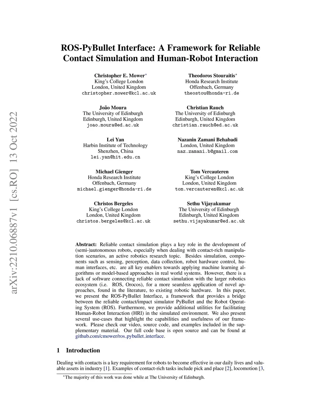 Reliable contact simulation plays a key role in the development of (semi-)autonomous robots, especially when dealing with contact-rich manipulation scenarios, an active robotics research topic. Besides simulation, components such as sensing, perception, data collection, robot hardware control, human interfaces, etc. are all key enablers towards applying machine learning algorithms or model-based approaches in real world systems. However, there is a lack of software connecting reliable contact simulation with the larger robotics ecosystem (i.e. ROS, Orocos), for a more seamless application of novel approaches, found in the literature, to existing robotic hardware. In this paper, we present the ROS-PyBullet Interface, a framework that provides a bridge between the reliable contact/impact simulator PyBullet and the Robot Operating System (ROS). Furthermore, we provide additional utilities for facilitating Human-Robot Interaction (HRI) in the simulated environment. We also present several use-cases that highlight the capabilities and usefulness of our framework. Please check our video, source code, and examples included in the supplementary material. Our full code base is open source and can be found at https://github.com/cmower/ros_pybullet_interface.