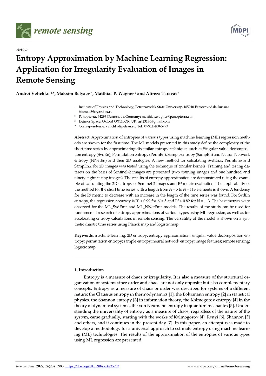 Approximation of entropies of various types using machine learning (ML) regression methods are shown for the first time. The ML models presented in this study define the complexity of the short time series by approximating dissimilar entropy techniques such as Singular value decomposition entropy (SvdEn), Permutation entropy (PermEn), Sample entropy (SampEn) and Neural Network entropy (NNetEn) and their 2D analogies. A new method for calculating SvdEn2D, PermEn2D and SampEn2D for 2D images was tested using the technique of circular kernels. Training and testing datasets on the basis of Sentinel-2 images are presented (two training images and one hundred and ninety-eight testing images). The results of entropy approximation are demonstrated using the example of calculating the 2D entropy of Sentinel-2 images and R^2 metric evaluation. The applicability of the method for the short time series with a length from N = 5 to N = 113 elements is shown. A tendency for the R^2 metric to decrease with an increase in the length of the time series was found. For SvdEn entropy, the regression accuracy is R^2 > 0.99 for N = 5 and R^2 > 0.82 for N = 113. The best metrics were observed for the ML_SvdEn2D and ML_NNetEn2D models. The results of the study can be used for fundamental research of entropy approximations of various types using ML regression, as well as for accelerating entropy calculations in remote sensing. The versatility of the model is shown on a synthetic chaotic time series using Planck map and logistic map.