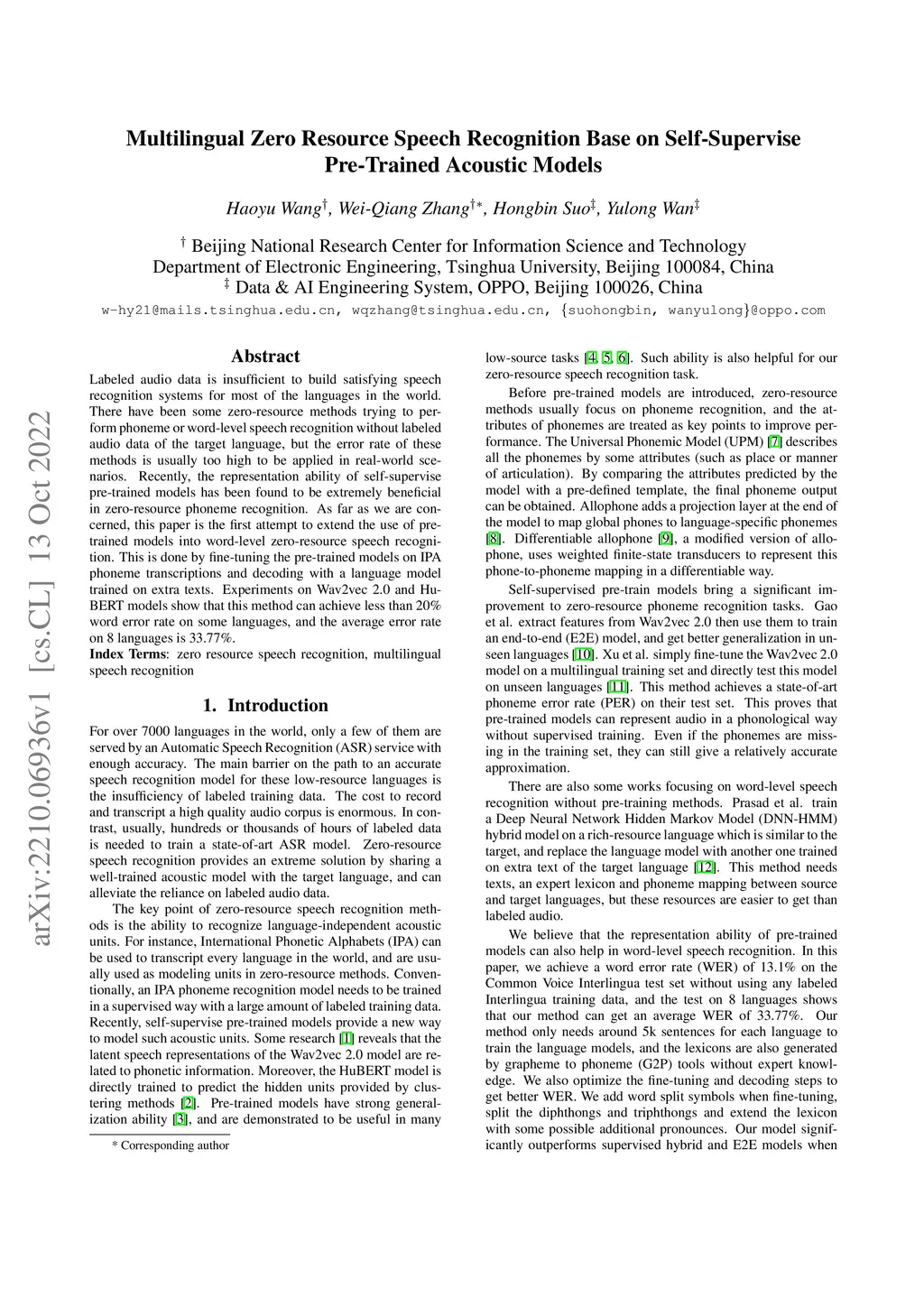 Multilingual Zero Resource Speech Recognition Base on Self-Supervise