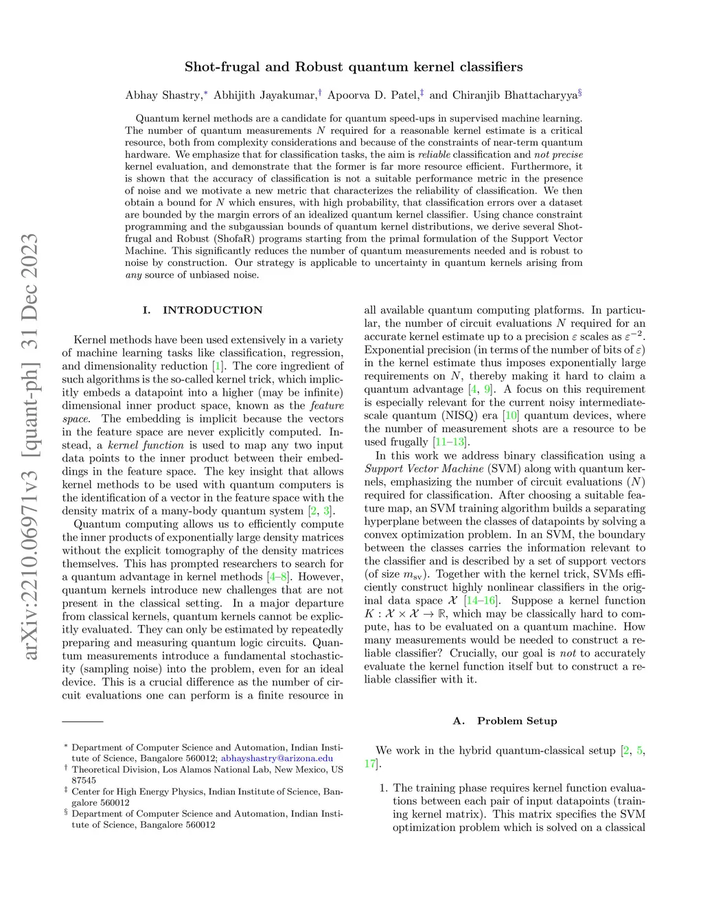 Quantum kernel methods are a candidate for quantum speed-ups in supervised machine learning. The number of quantum measurements N required for a reasonable kernel estimate is a critical resource, both from complexity considerations and because of the constraints of near-term quantum hardware. We emphasize that for classification tasks, the aim is reliable classification and not precise kernel evaluation, and demonstrate that the former is far more resource efficient. Furthermore, it is shown that the accuracy of classification is not a suitable performance metric in the presence of noise and we motivate a new metric that characterizes the reliability of classification. We then obtain a bound for N which ensures, with high probability, that classification errors over a dataset are bounded by the margin errors of an idealized quantum kernel classifier. Using chance constraint programming and the subgaussian bounds of quantum kernel distributions, we derive several Shot-frugal and Robust (ShofaR) programs starting from the primal formulation of the Support Vector Machine. This significantly reduces the number of quantum measurements needed and is robust to noise by construction. Our strategy is applicable to uncertainty in quantum kernels arising from any source of unbiased noise.