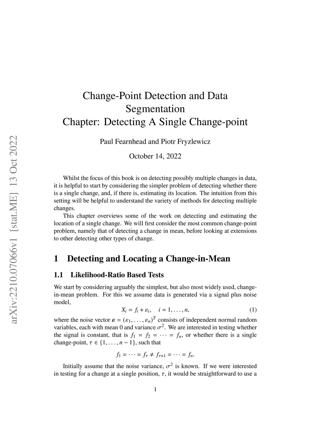 This chapter overviews some of the work on detecting and estimating the location of a single change. We first consider the most common change-point problem, namely that of detecting a change in mean, before looking at extensions to detecting other types of change. The intuition from the problem of detecting a single change-point is helpful for understanding the variety of methods for detecting multiple changes.