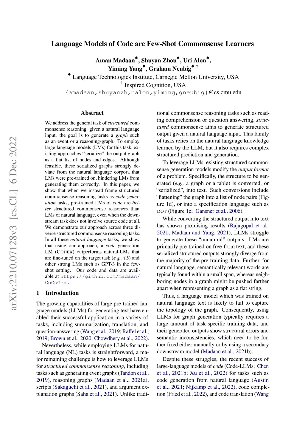We address the general task of structured commonsense reasoning: given a natural language input, the goal is to generate a graph such as an event -- or a reasoning-graph. To employ large language models (LMs) for this task, existing approaches ``serialize'' the output graph as a flat list of nodes and edges. Although feasible, these serialized graphs strongly deviate from the natural language corpora that LMs were pre-trained on, hindering LMs from generating them correctly. In this paper, we show that when we instead frame structured commonsense reasoning tasks as code generation tasks, pre-trained LMs of code are better structured commonsense reasoners than LMs of natural language, even when the downstream task does not involve source code at all. We demonstrate our approach across three diverse structured commonsense reasoning tasks. In all these natural language tasks, we show that using our approach, a code generation LM (CODEX) outperforms natural-LMs that are fine-tuned on the target task (e.g., T5) and other strong LMs such as GPT-3 in the few-shot setting.