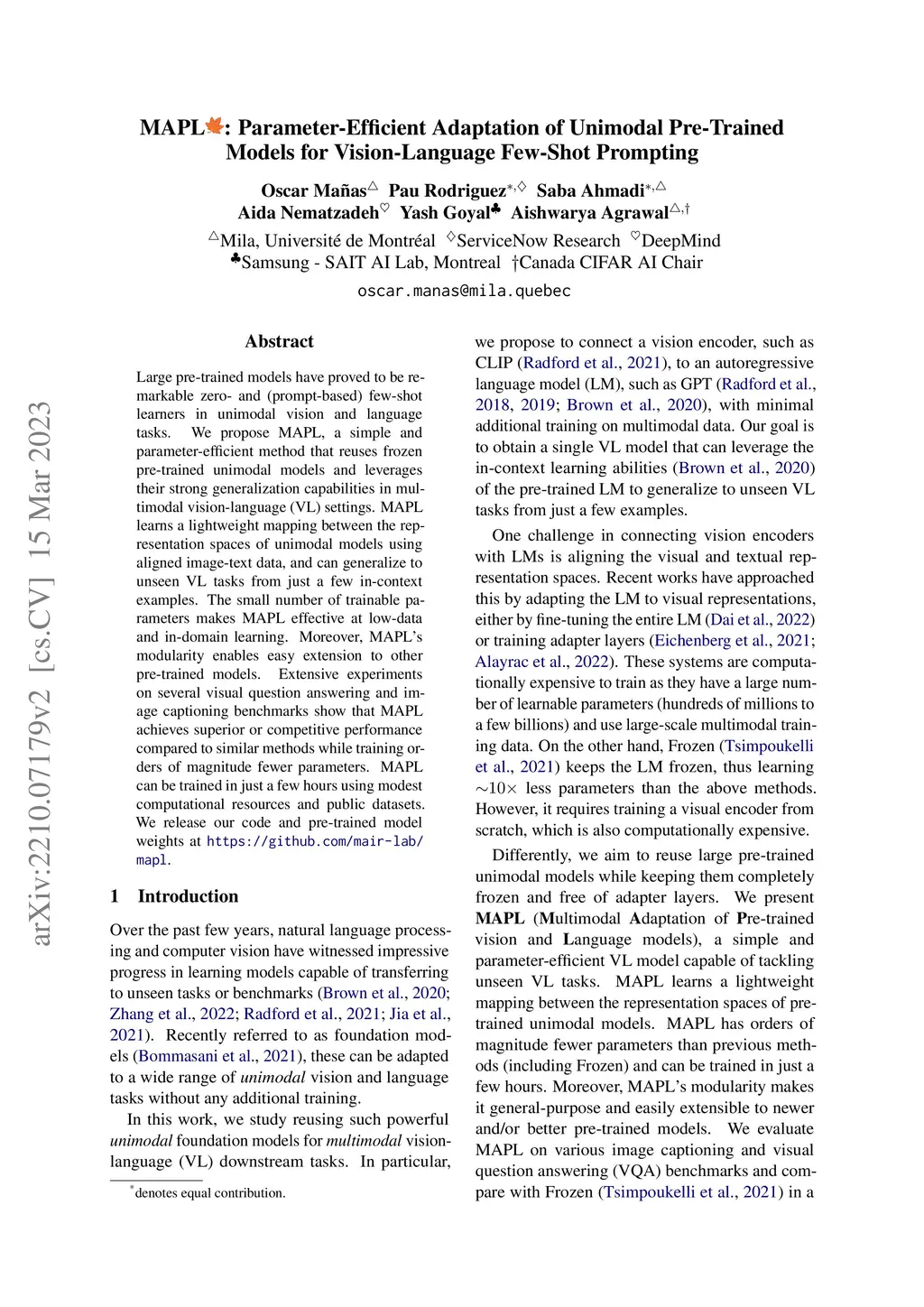 MAPL: Parameter-Efficient Adaptation of Unimodal Pre-Trained Models for