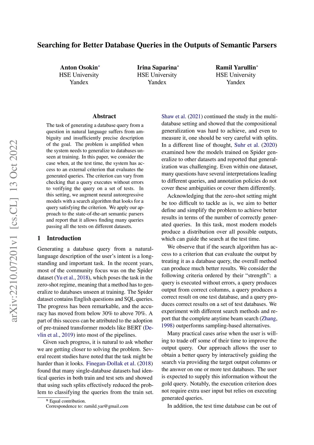 The task of generating a database query from a question in natural language suffers from ambiguity and insufficiently precise description of the goal. The problem is amplified when the system needs to generalize to databases unseen at training. In this paper, we consider the case when, at the test time, the system has access to an external criterion that evaluates the generated queries. The criterion can vary from checking that a query executes without errors to verifying the query on a set of tests. In this setting, we augment neural autoregressive models with a search algorithm that looks for a query satisfying the criterion. We apply our approach to the state-of-the-art semantic parsers and report that it allows us to find many queries passing all the tests on different datasets.