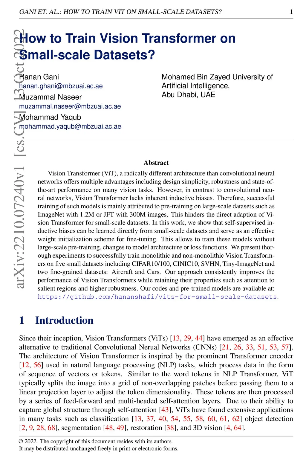 Vision Transformer (ViT), a radically different architecture than convolutional neural networks offers multiple advantages including design simplicity, robustness and state-of-the-art performance on many vision tasks. However, in contrast to convolutional neural networks, Vision Transformer lacks inherent inductive biases. Therefore, successful training of such models is mainly attributed to pre-training on large-scale datasets such as ImageNet with 1.2M or JFT with 300M images. This hinders the direct adaption of Vision Transformer for small-scale datasets. In this work, we show that self-supervised inductive biases can be learned directly from small-scale datasets and serve as an effective weight initialization scheme for fine-tuning. This allows to train these models without large-scale pre-training, changes to model architecture or loss functions. We present thorough experiments to successfully train monolithic and non-monolithic Vision Transformers on five small datasets including CIFAR10/100, CINIC10, SVHN, Tiny-ImageNet and two fine-grained datasets: Aircraft and Cars. Our approach consistently improves the performance of Vision Transformers while retaining their properties such as attention to salient regions and higher robustness. Our codes and pre-trained models are available at: https://github.com/hananshafi/vits-for-small-scale-datasets.