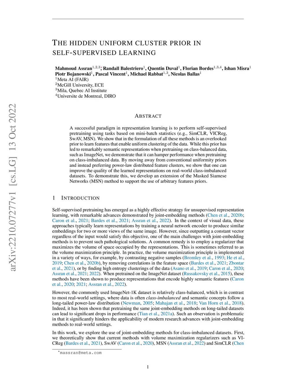 A successful paradigm in representation learning is to perform self-supervised pretraining using tasks based on mini-batch statistics (e.g., SimCLR, VICReg, SwAV, MSN). We show that in the formulation of all these methods is an overlooked prior to learn features that enable uniform clustering of the data. While this prior has led to remarkably semantic representations when pretraining on class-balanced data, such as ImageNet, we demonstrate that it can hamper performance when pretraining on class-imbalanced data. By moving away from conventional uniformity priors and instead preferring power-law distributed feature clusters, we show that one can improve the quality of the learned representations on real-world class-imbalanced datasets. To demonstrate this, we develop an extension of the Masked Siamese Networks (MSN) method to support the use of arbitrary features priors.